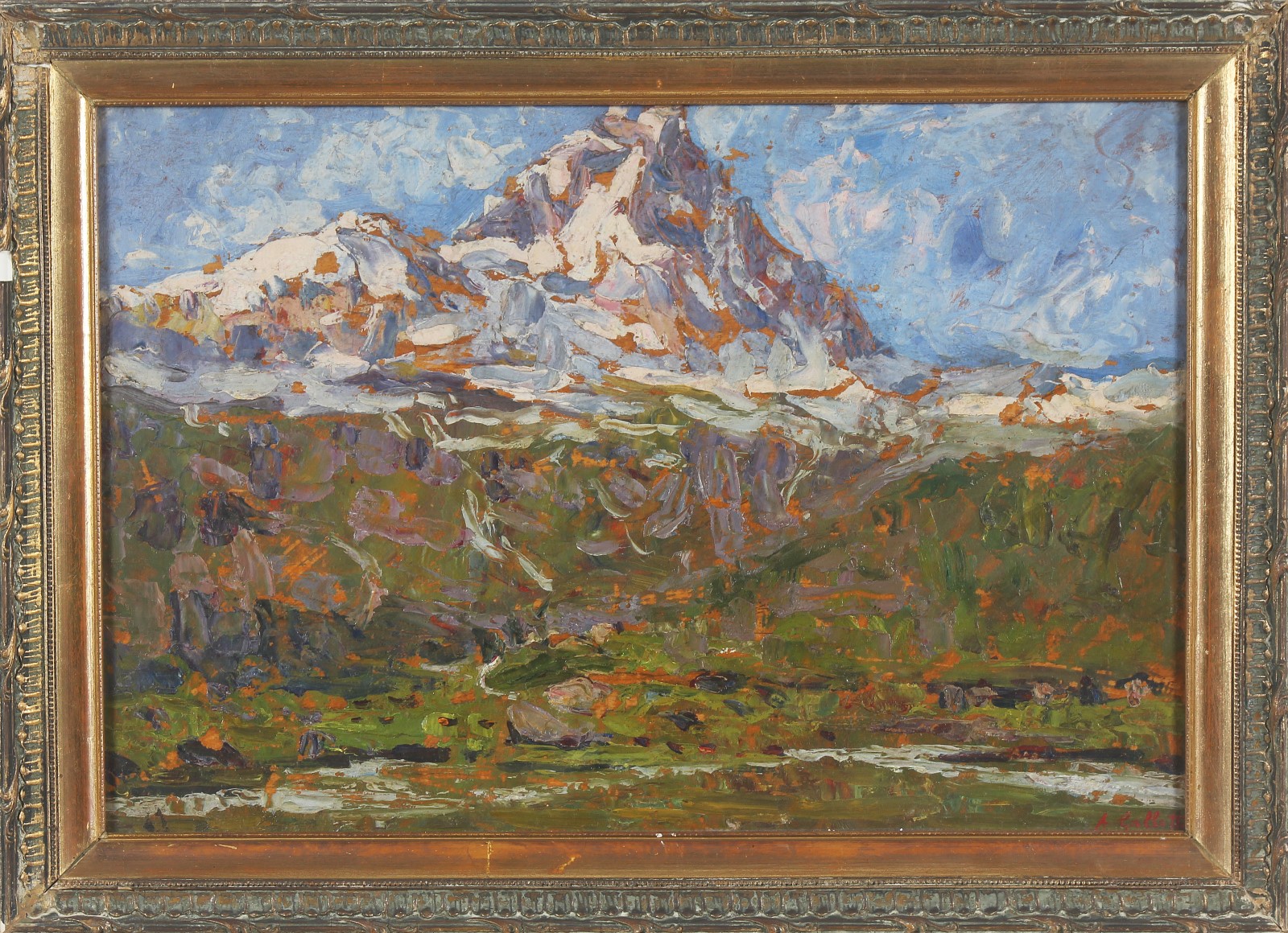 GALLOTTI ALESSANDRO (1879 - 1961) Il Cervino. Olio su tavola. Cm 47,00 x 35,00. Firma in basso a destra. Al retro titolo e firma. Cornice presente