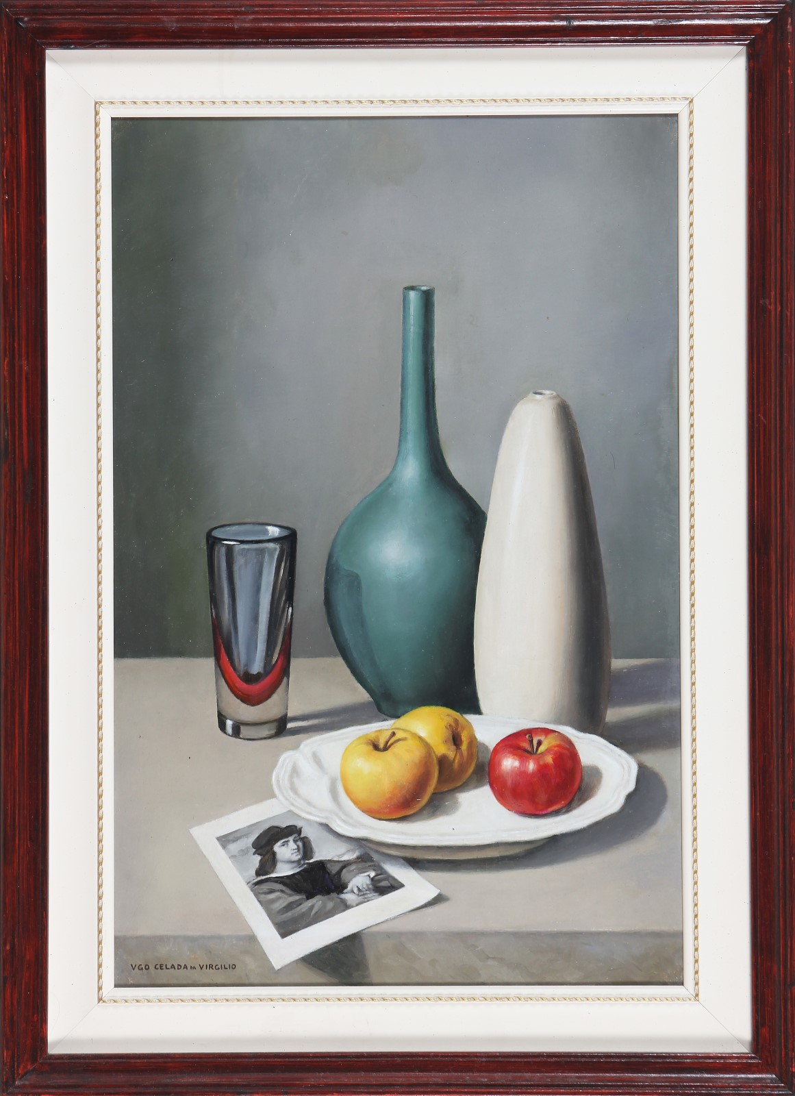 CELADA DA VIRGILIO UGO (1895 - 1995) Composizione con frutta e vasi. Olio su tavola. Cm 39,00 x 60,00. Firma in basso a sinistra. Cornice presente