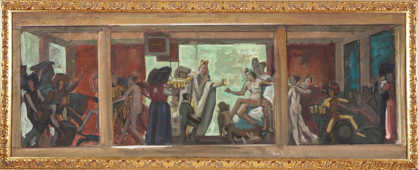 RESENTERA WALTER (1907 - 1995) Re Gambrinus inventa la birra (bozzetto per affresco mai eseguito). Tempera su tavola. Cm 145,00 x 54,00. Firmato. Anni '30. Mancanze di pittura. Cornice presente