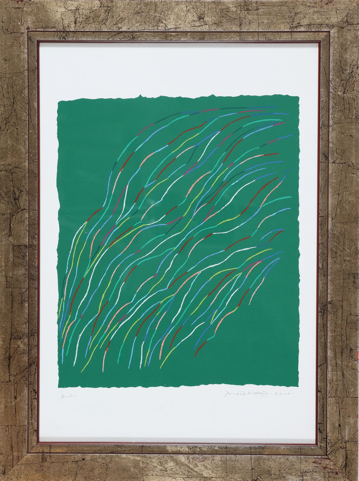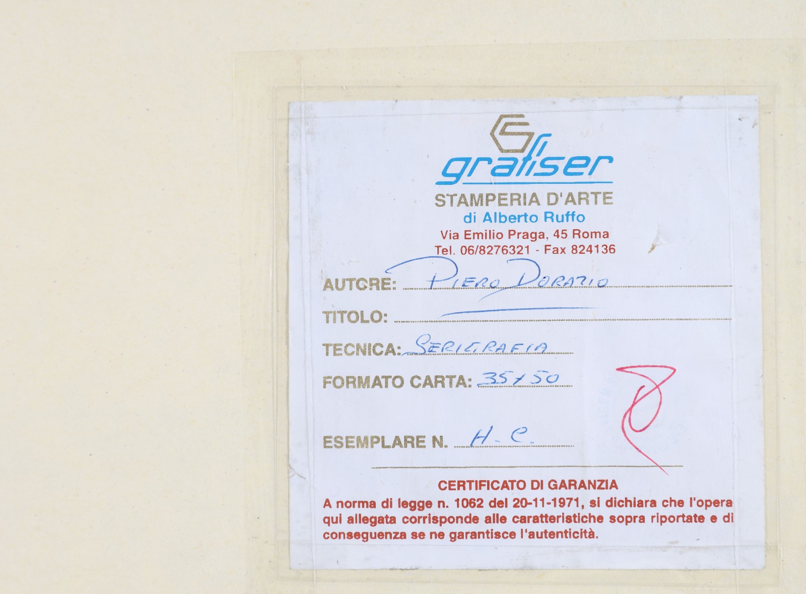 DORAZIO PIERO (1927 - 2005) Senza titolo. Serigrafia. Cm 35,00 x 50,00. H.c. Tiratura, firma e anno a matita in basso. Timbro a secco Stamperia d'Arte di Alberto Ruffo, Roma in basso a sinistra. Al retro certificato di garanzia a cura della Stamperia d'Arte di Alberto Ruffo, Roma. Cornice presente