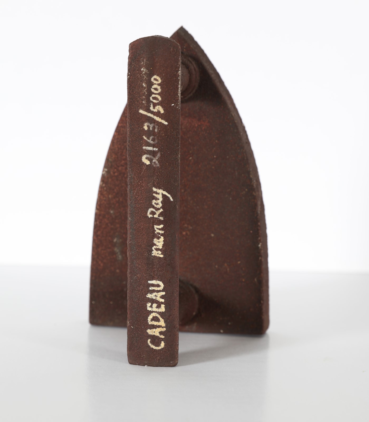 MAN RAY (1890 - 1976) Cadeau. Ferro. Cm 17,00 x 10,00 x 10,00. 1921/1974. Firma anno e tiratura nella parte superiore sul manico. Opera contenuta nella sua confezione originale di polistirolo, completa di card di plastica e scheda di Arturo Schwarz con tiratura a biro. Edizione: 2163/5000.