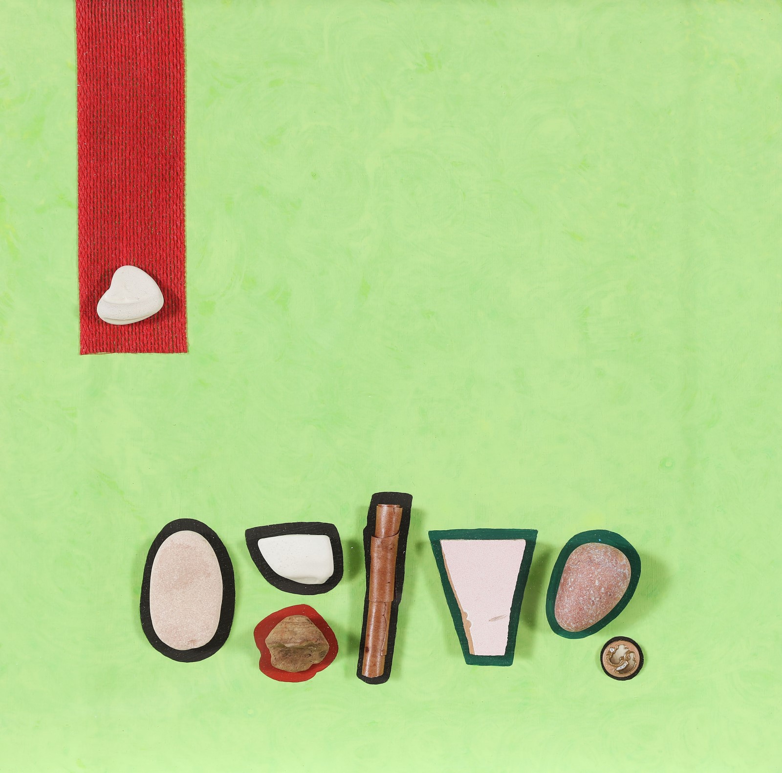 VOLPATI CARLA (n. 1954) Ricordo. 2006. Tecnica mista su cartone. Cm 30,00 x 30,00. Frammenti di natura, bottone, stoffa e colori acrilici su tavola. Autentica dell'artista su fotografia. Pubblicazioni: Carla Volpati, AP Editore srl, pag.63 (allegato all'opera). Cornice presente