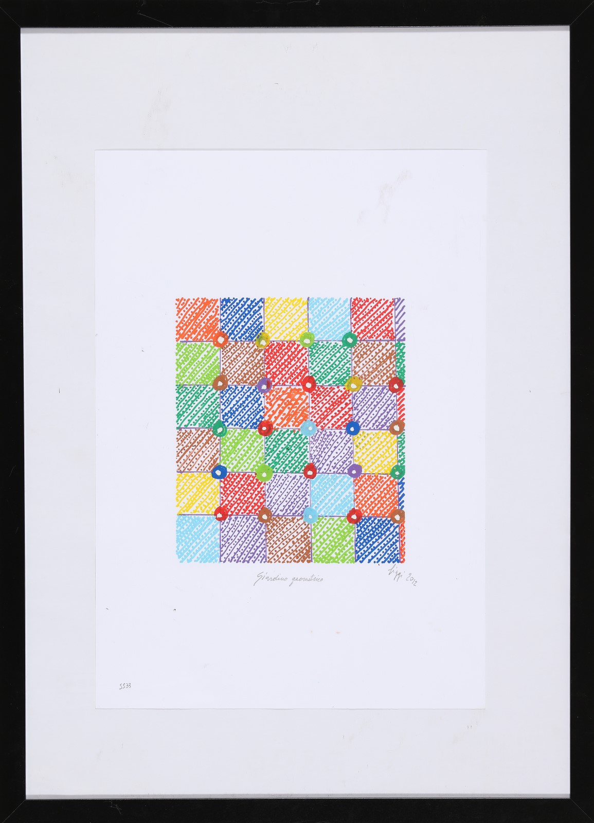 BIGGI GASTONE (n. 1925) Giardino geometrico. 2012. Tecnica mista su carta. Cm 35,00 x 50,00. Titolo, firma e anno in basso. Provenienza. Shopping tv. Cornice presente