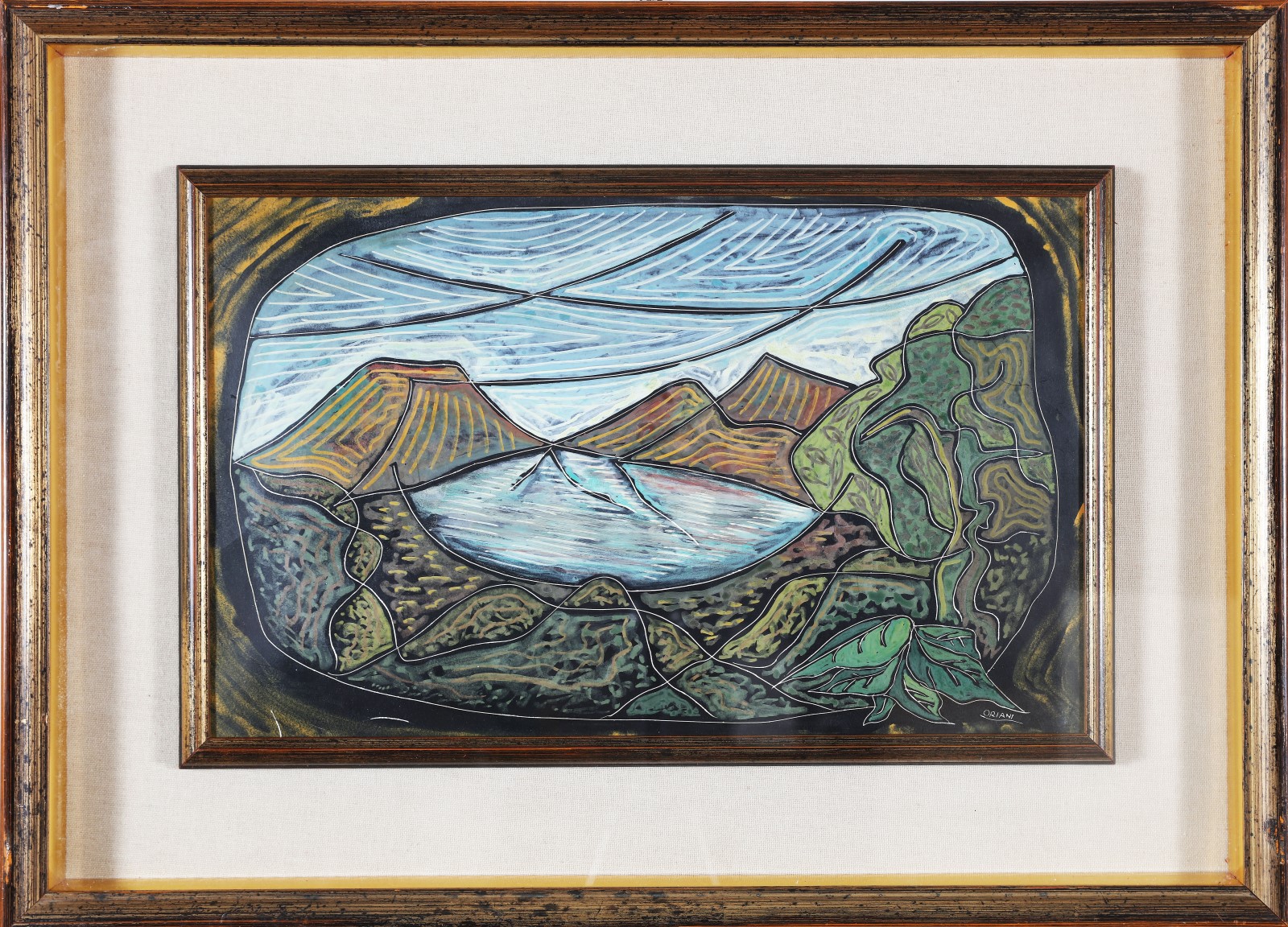 ORIANI PIPPO (1909 - 1972) Lago. Encausto su cartone. Cm 48,00 x 30,00. Firma in basso a destra. Al retro titolo e firma. Opera archiviata presso l'Oriani Foundation, Canada come da documentazione fotografica allegata all'opera.1935/1938. Cornice presente