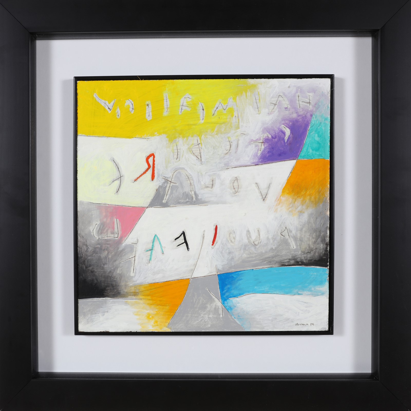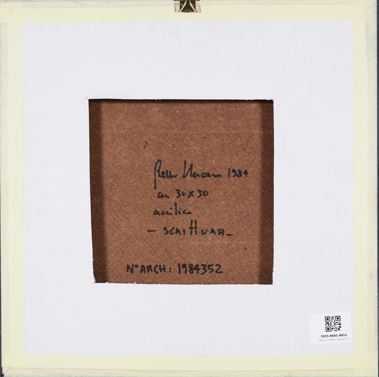 NUCARA RENZO (n. 1955) Scrittura. 1984. Tecnica mista su tavola. Cm 30,00 x 30,00. Firma e anno in basso a destra. Al retro firma, titolo e anno. Autentica dell'artista su fotografia riportante il relativo numero d'inventario. Cornice presente
