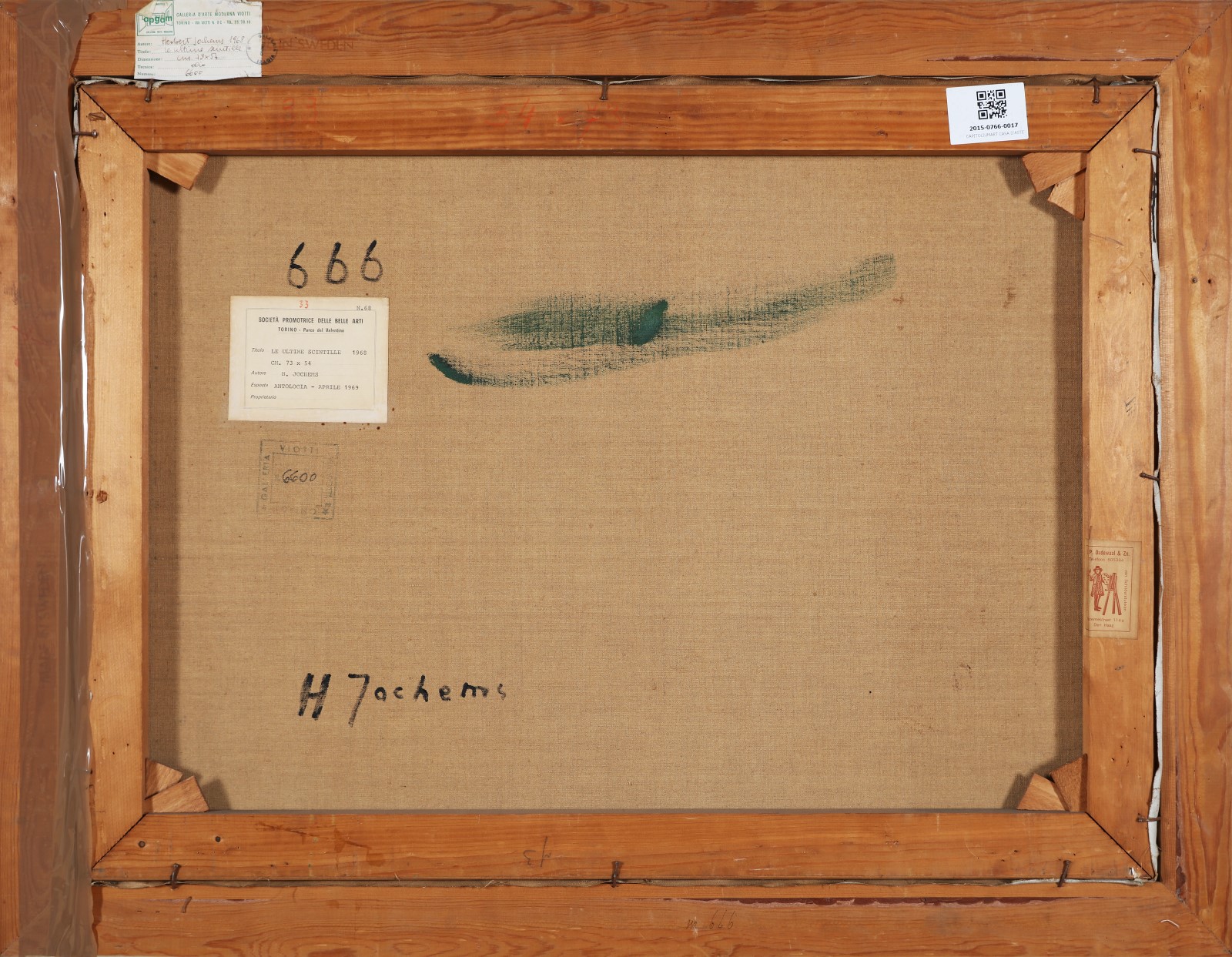 JOCHEMS HERBERT (1912 - 1975) Le ultime scintille. 1968. Olio su tela. Cm 73,00 x 54,00. Firma in basso a sinistra. Al retro firma, cartiglio descrittivo a cura della Società Promotrice delle Belle Arti, Torino e cartiglio descrittivo con timbro a cura della Galleria d'Arte Moderna Viotti, Torino. Cornice presente
