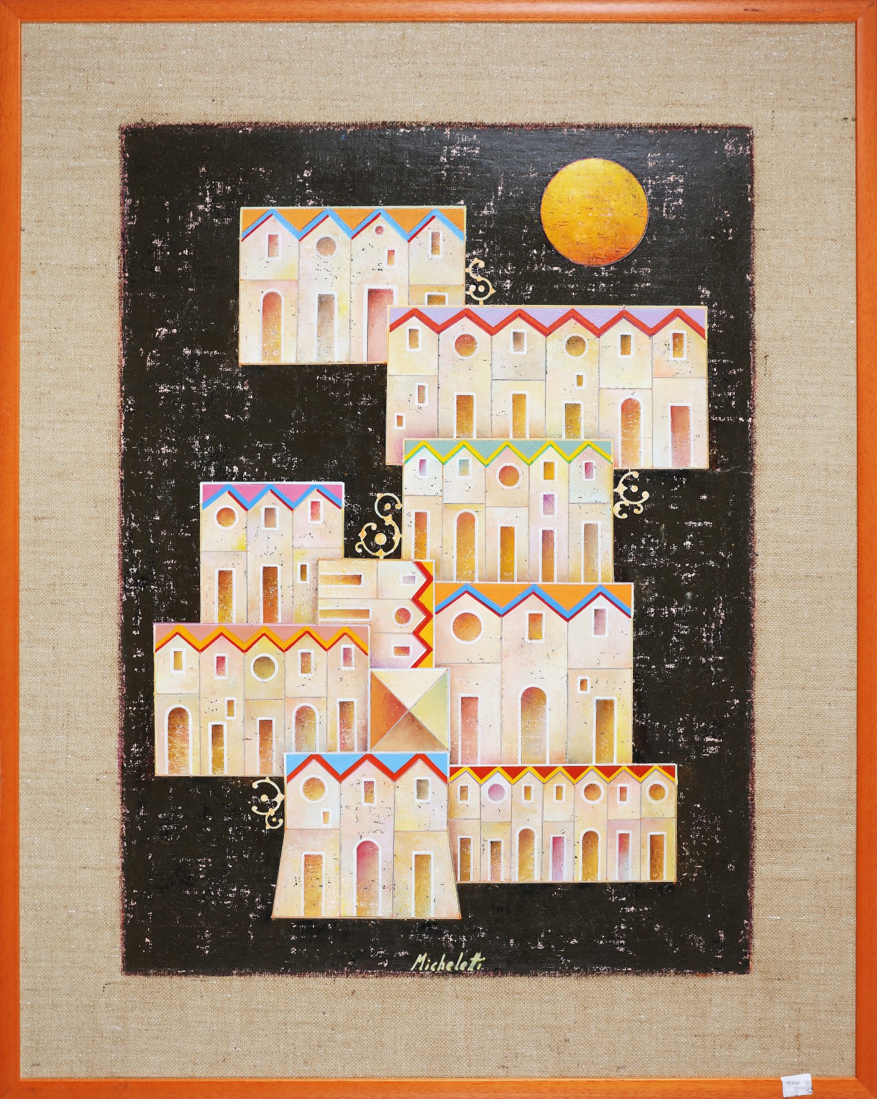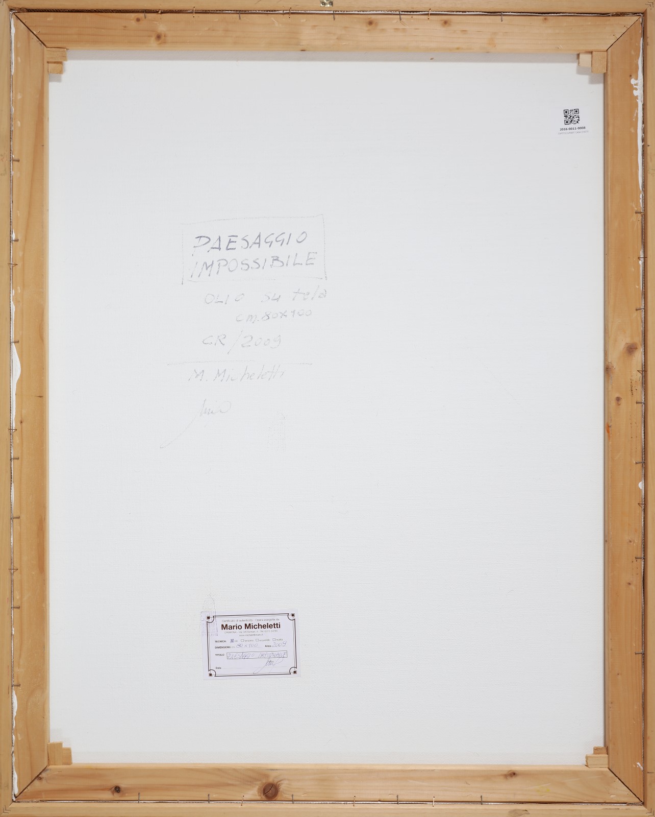 MICHELETTI MARIO (1936 - 2011) Paesaggio impossibile. 2009. Olio su tela di juta. Cm 80,00 x 101,00. Firma in basso al centro. Al retro titolo, firma, anno e cartiglio descrittivo a cura dell'artista con firma per autentica. Cornice presente