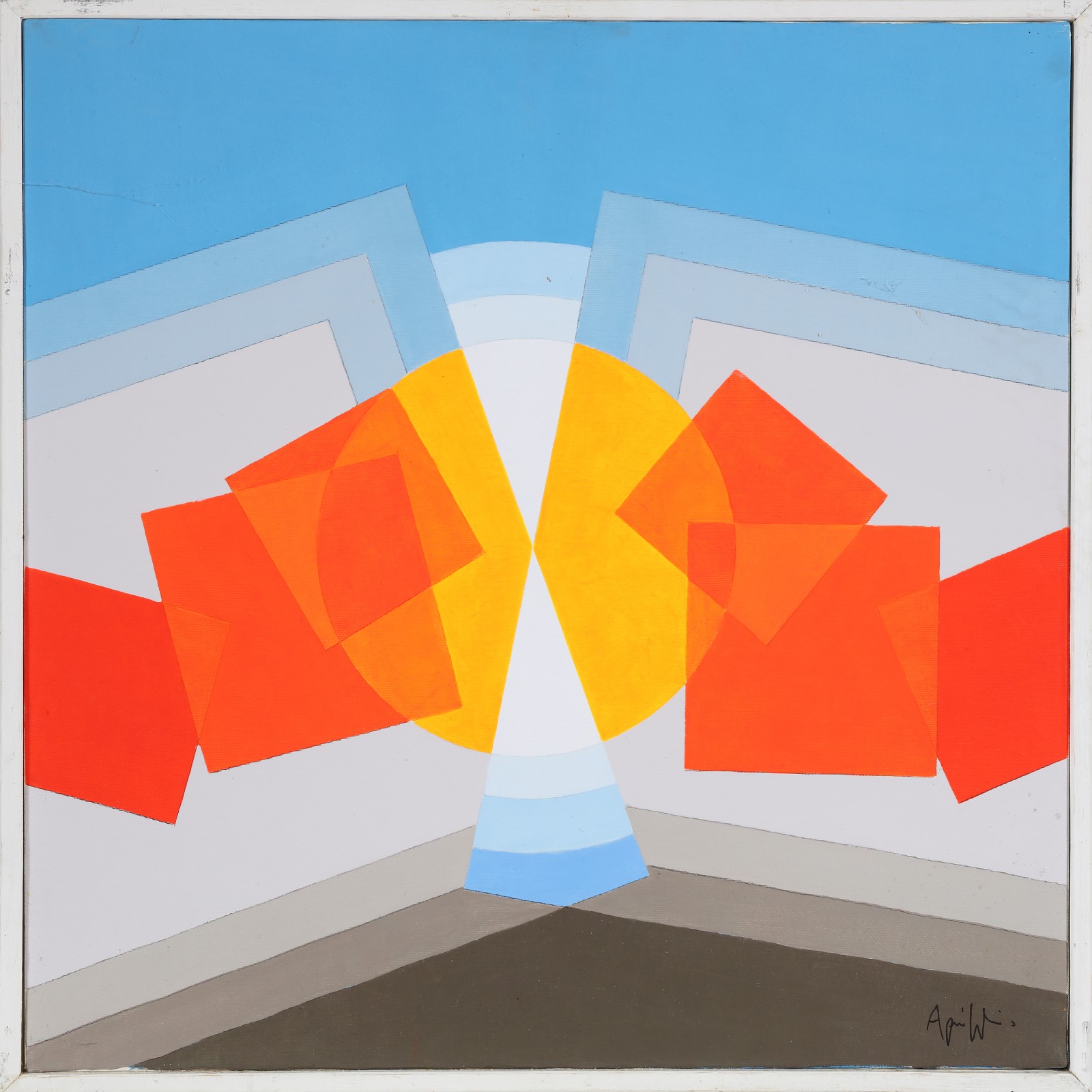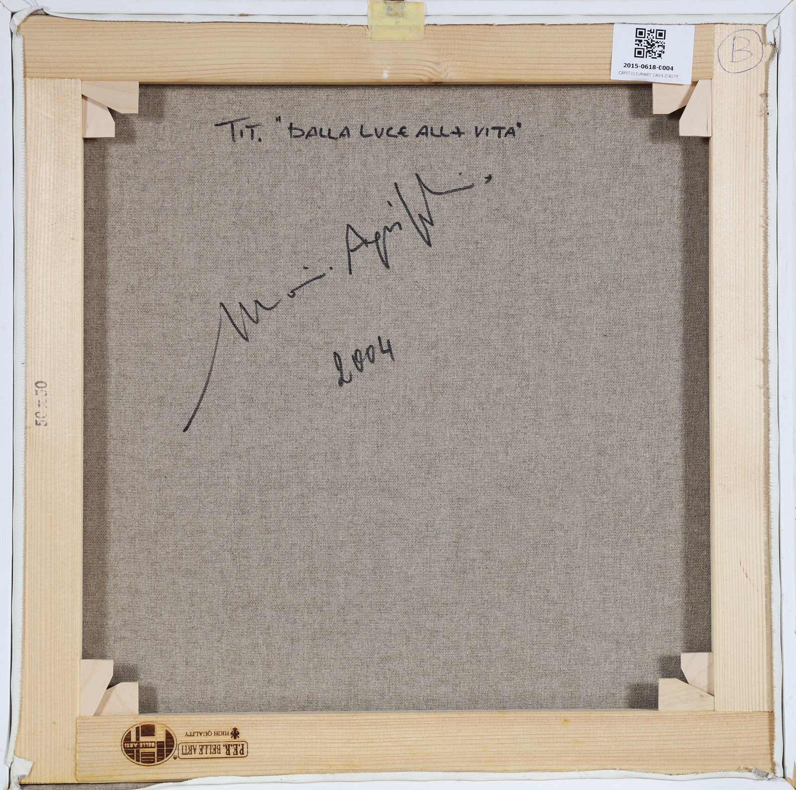 AGRIFOGLIO MARIO (1935 - 2014) Dalla Luce alla vita. 2004. Tecnica mista su tela. Cm 50,00 x 50,00. Firma in bassoa destra. Al retro firma, titolo e anno. Autentica su fotografia a cura della Fondazione Mario Agrifoglio, Favizzano. Materia pittorica rispondente alla luce di Wood. Cornice presente