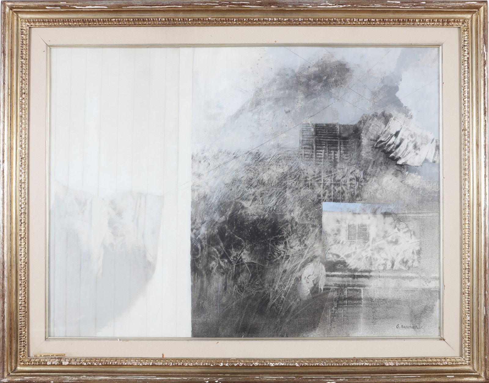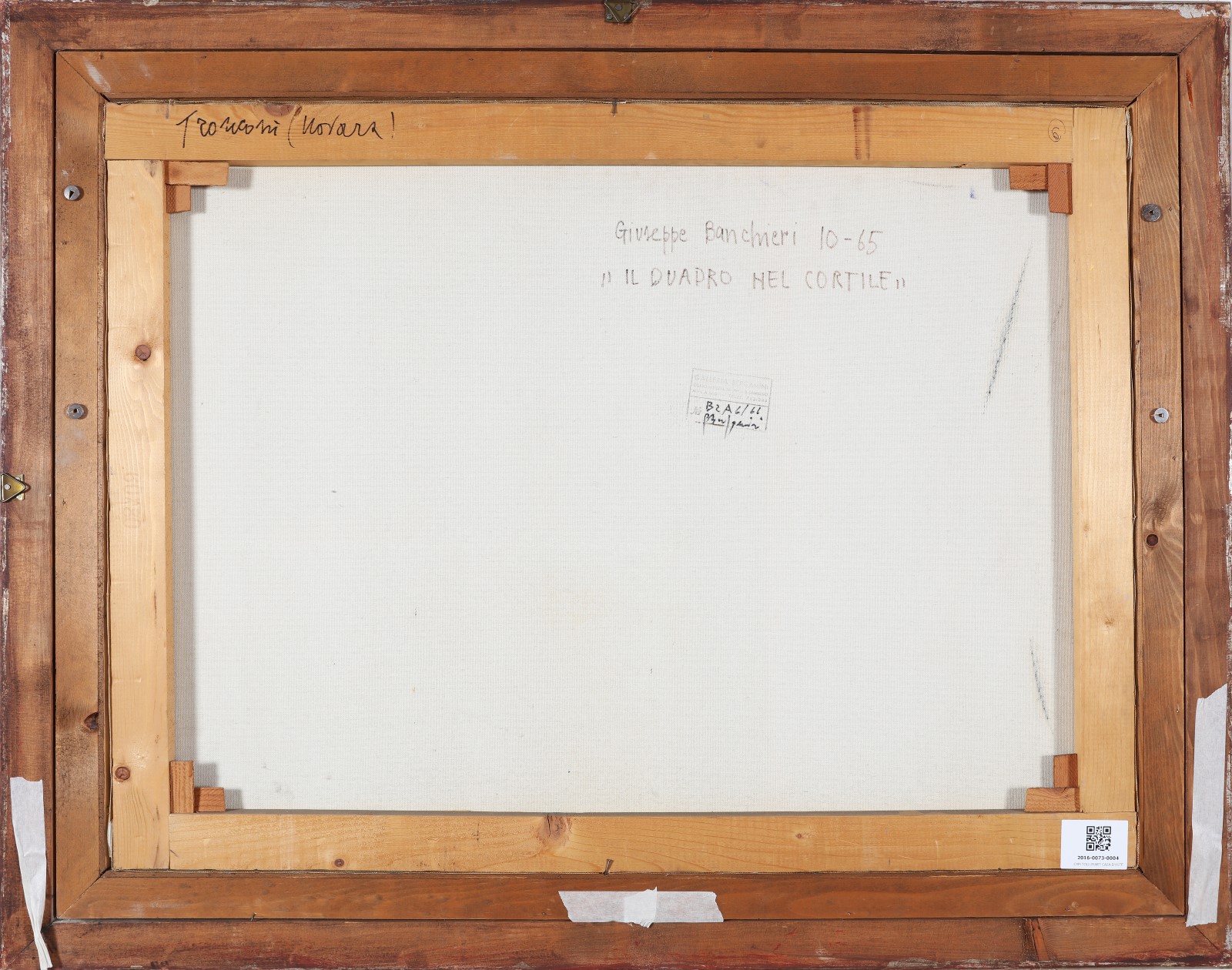 BANCHIERI GIUSEPPE (1927 - 1994) Il quadro nel cortile. 1965. Olio su tela. Cm 80,00 x 60,00. Firmato in basso a destra. Al retro titolo firrma e data. Al retro timbro della Galleria Bergamini. Pubblicato sul catalogo della Galleria Bergamini del 10 maggio 1966 allegata all'opera.