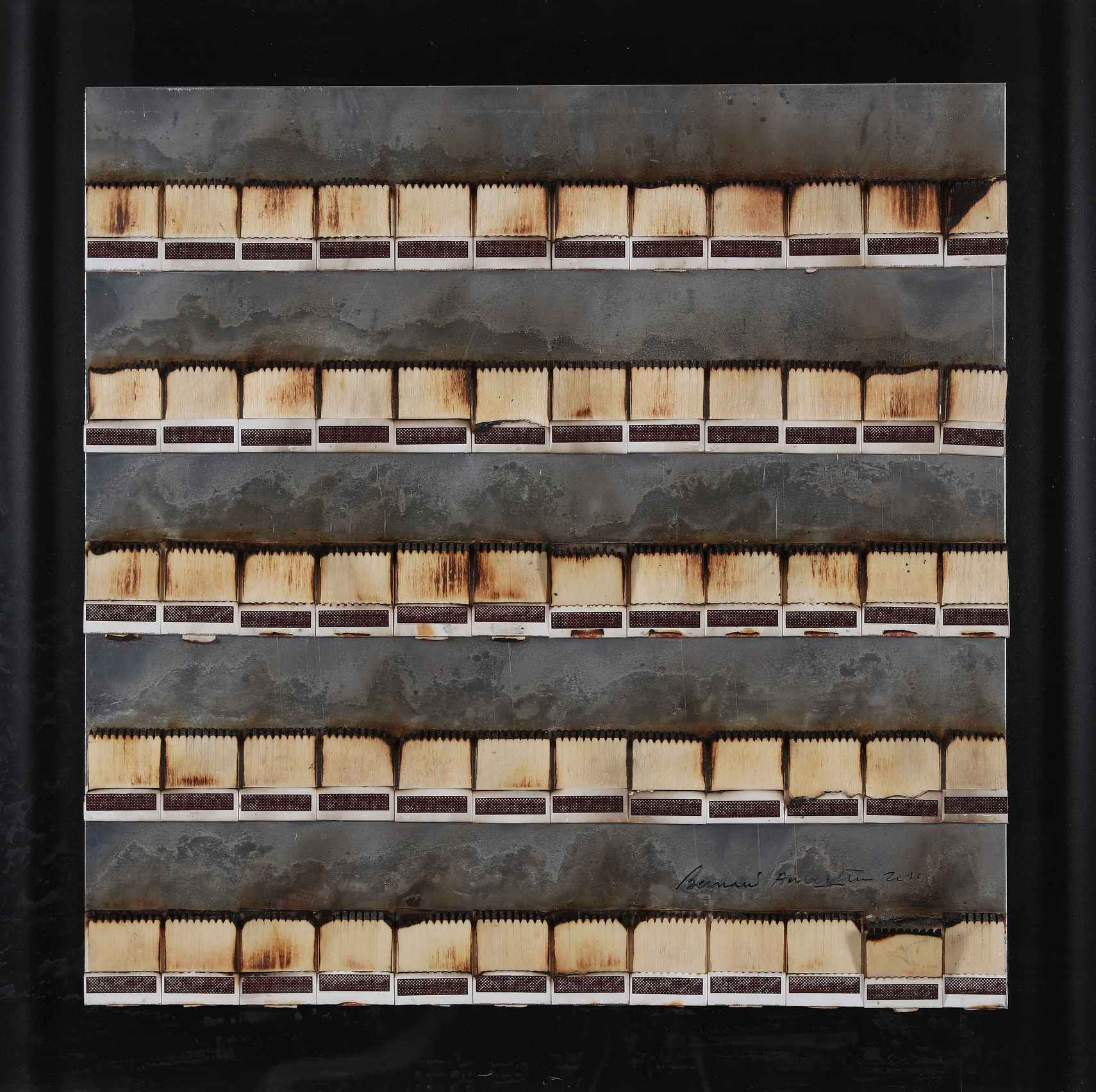 AUBERTIN BERNARD (n. 1934) Fiammiferi bruciati. 2010. Fiammiferi bruciati su alluminio. Cm 60,00 x 60,00. Firma e anno in basso a destra. Autentica dell'artista su fotografia. Pubblicazione: Opera pubblicata sul Volume Fuoco e Metallo a cura dell'Archivio Bernard Aubertin, pag. 110. Opera contenuta in una teca di plexiglas.