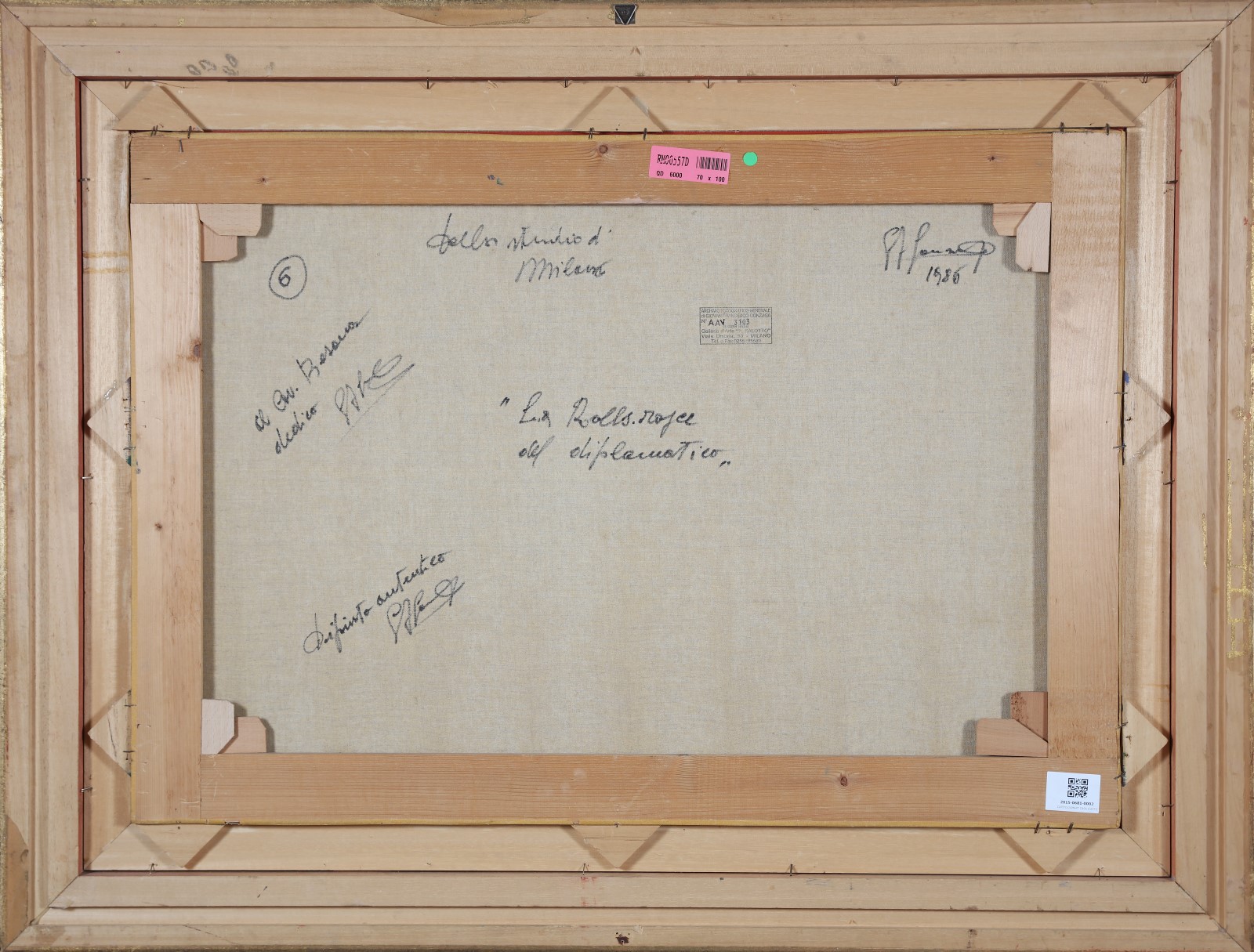 GONZAGA GIOVAN FRANCESCO (1921 - 2007) La Rolls Rojce del diplomatico. 1986. Olio su tela. Cm 100,00 x 70,00. Firma in basso a destra. Al retro firma per autentica , titolo, anno e timbro a cura dell'Archivio Fotografico Generale di G.F.Gonzaga con relativo numero d'inventario. Autentica dell'artista su fotografia con timbro a cura della Galleria d'Arte Il Salotto, Milano riportante il relativo numero d'inventario. Pubblicazione: Opera pubblicata sul Catalogo Generale delle Opere di Giovanni Francesco Gonzaga , Volume I. Cornice presente