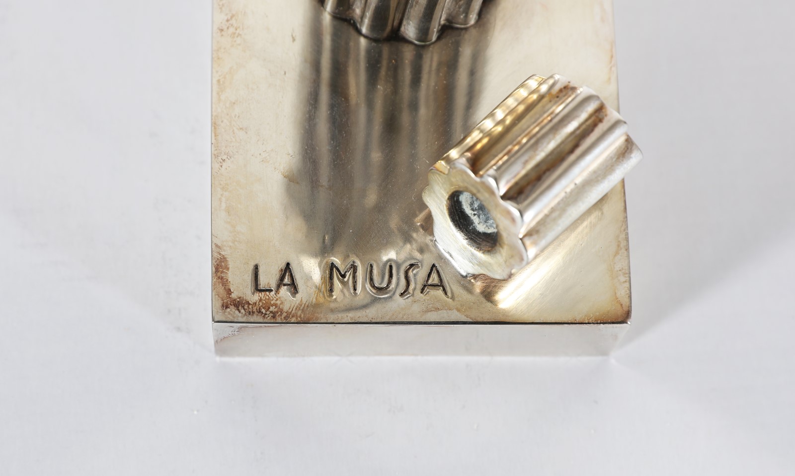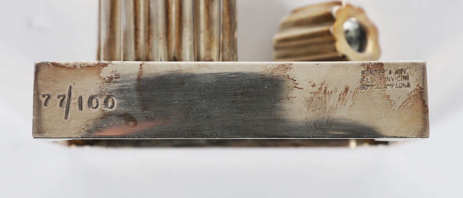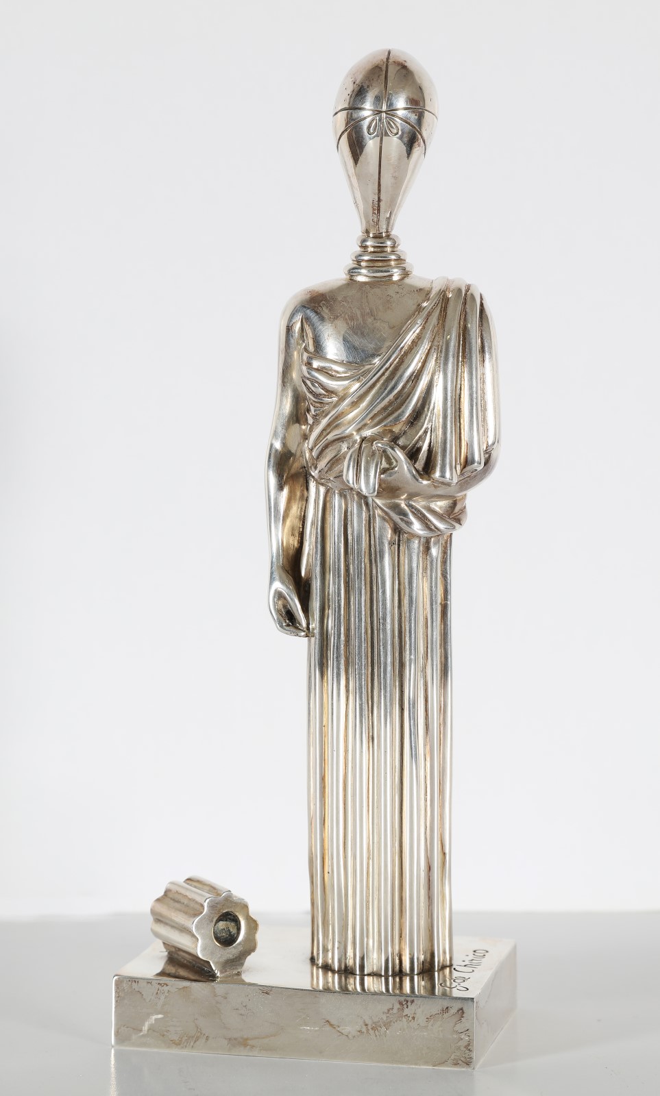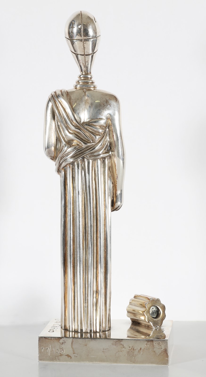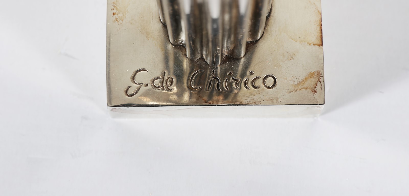 DE CHIRICO GIORGIO (1888 - 1978) La musa con la colonna spezzata. 1970. bronzo argentato. Cm 11,00 x 30,50 x 7,50. Edizione completa: 1/100 esemplari in bronzo argentato; I/C esemplari in bronzo dorato. Esemplare: 77. Tiratura, firma e timbro fonditore (Bonvicini Sommacampagna) incisi sulla base.