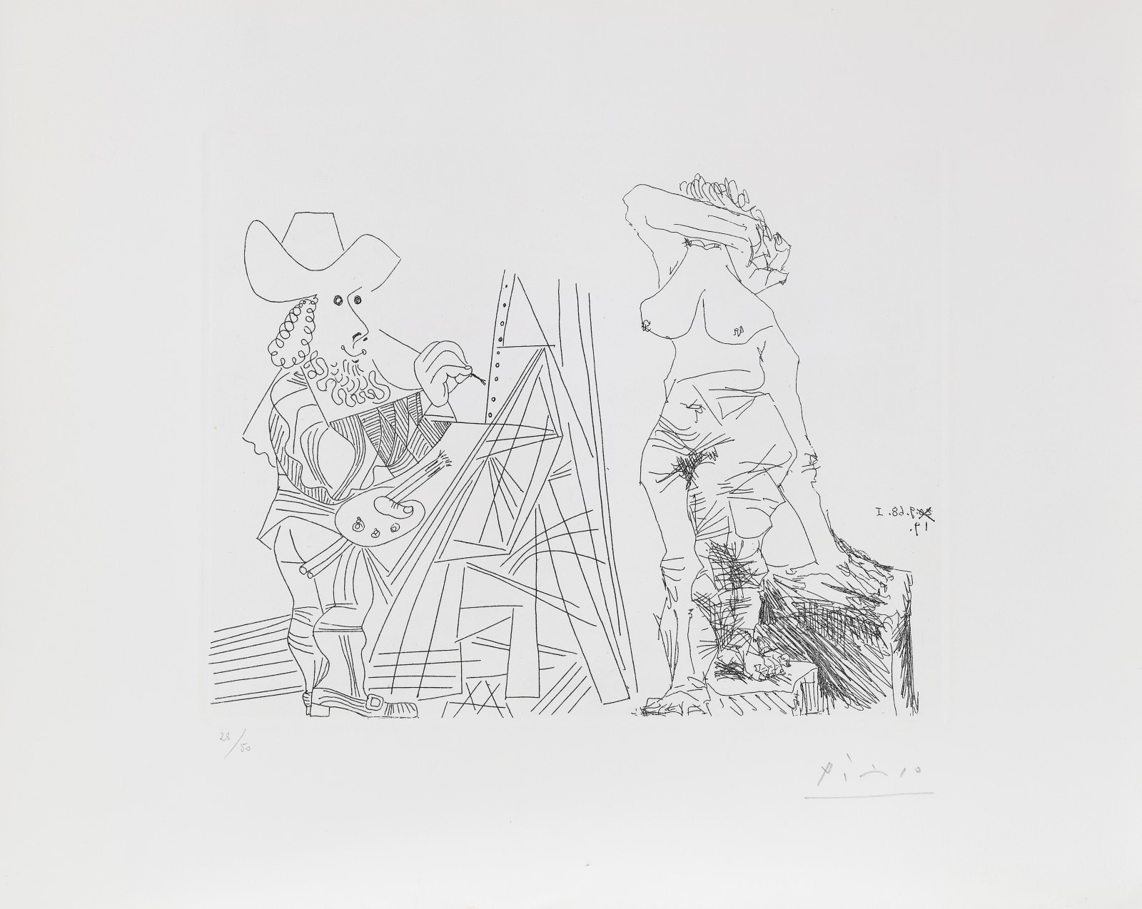 PICASSO PABLO (1881 - 1973) Peintre et modele qui se cache le visage. 1968. Acquaforte. Cm 40,00 x 32,50. 28/50. Tiratura e firma in basso a matita. Dimensioni lastra: 20,8x26,6 cm. Bibliografia: G. Bloch, Catalogue de l'oeuvre gravé et lithographié 1966-69, Tomo II, n. 1804. Editore: Galeria L. Leris, Parigi, serie 347.