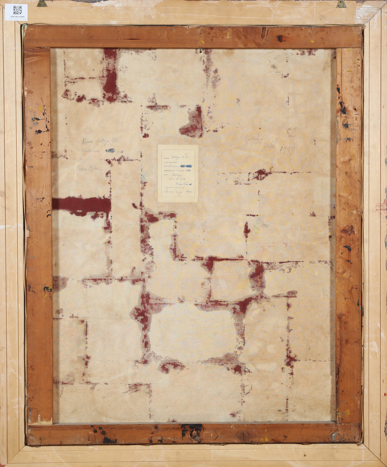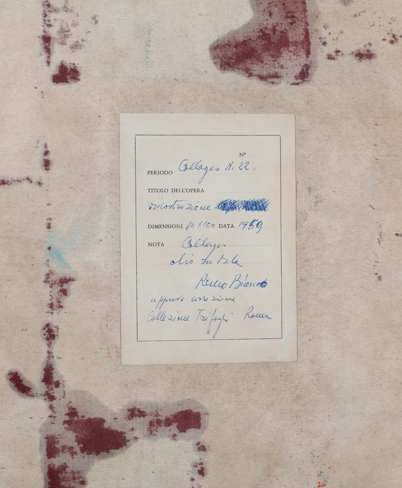 BIANCO REMO (1922 - 1990) Ricostruzione. 1959. Collage su tela. Cm 80,00 x 100,00. Firma in basso a destra. Al retro reca il cartiglio dell'autore con i dati identificativi dell'opera. Cornice presente