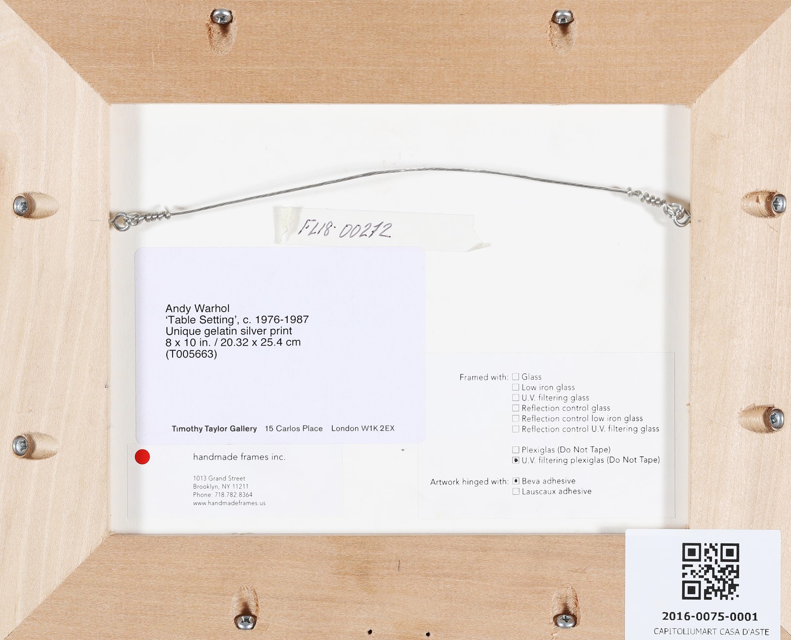 WARHOL ANDY (1928 - 1987) Table setting. 1986. Stampa alla gelatina d'argento. Cm 25,00 x 19,50. Al retro cartiglio Timothy Taylor Gallery, Londra. Opera archiviata presso la Andy Warhol Foundation for visual arts, come da documentazione fotografica allegata all'opera riportante il relativo numero d'inventario. . Cornice presente
