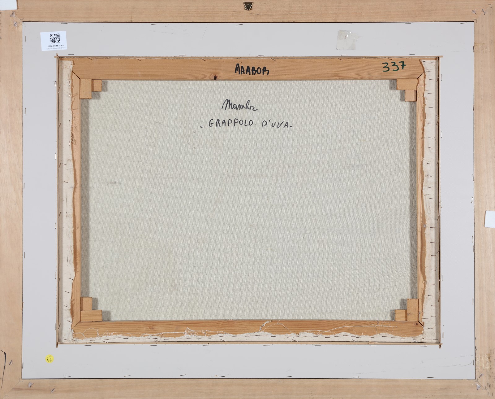 MAMBOR RENATO (n. 1936) Grappolo d'uva. 1963. Olio su tela. Cm 80,00 x 60,00. Firma in basso a sinistra. Al retro titolo e firma. Autentica dell'artista e timbro della galleria Art TIme, Brescia, su fotografia.