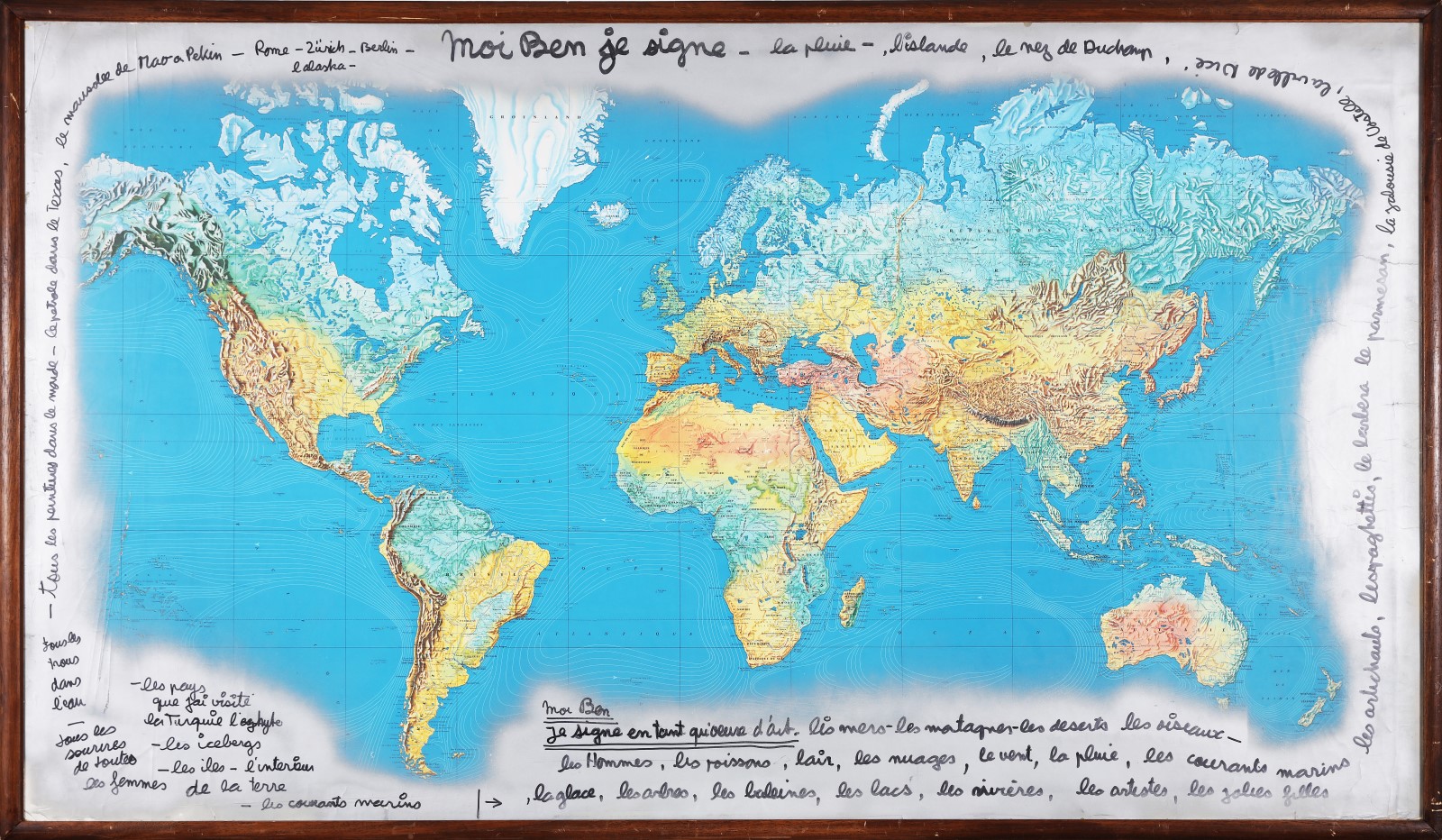 VAUTIER BEN (n. 1935) Moi Ben Je Signe. 1978. Tecnica mista su carta geografica.. Cm 143,00 x 85,00. Autentica dell'artista su fotografia. Provenienza: Cenobio Visualità, Milano; Dorotheum, asta del 26/11/2008, lotto 277.