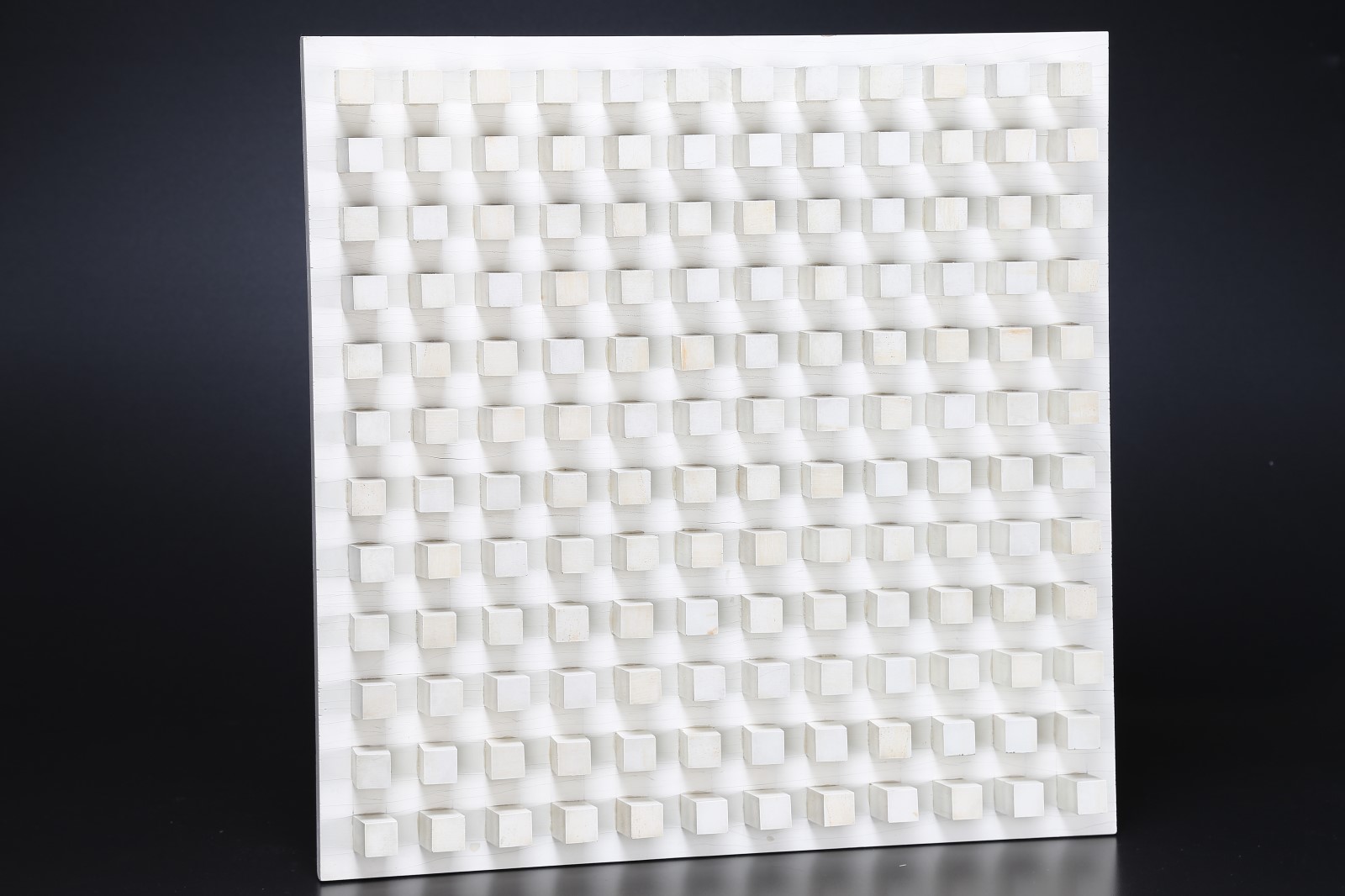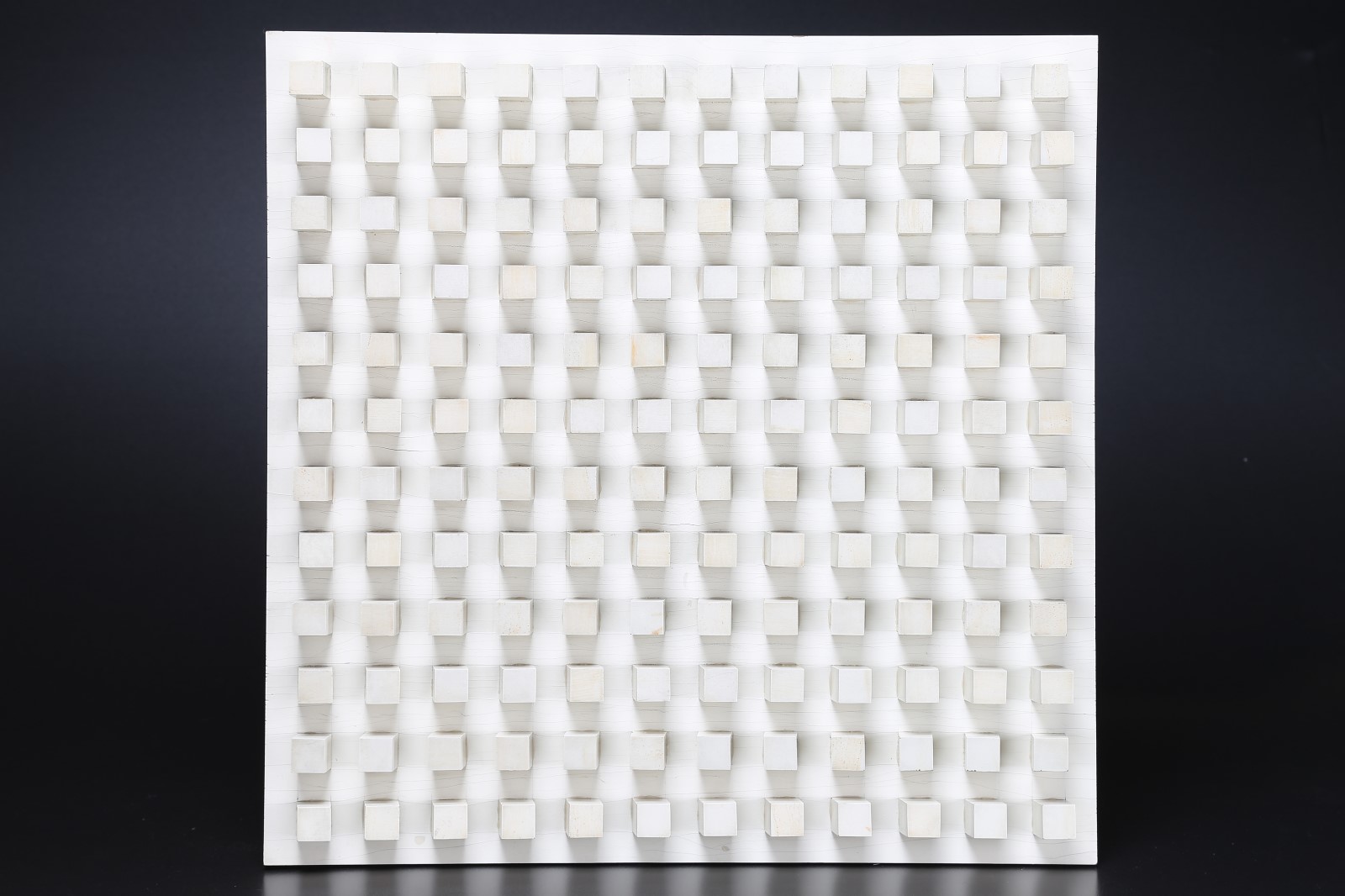 DADAMAINO (1935 - 2004) Cromorilievo. 1975. Tasselli di legno dipinto su tavola. Cm 50,00 x 50,00. Titolo, firma, anno e dicitura "rilievo bianco - 1975 - inclinazione: 3 gradi - 50x50" al retro. Dedica a Franco e Maria Viganò sempre al retro datata 1975. Opera archiviata presso l'Archivio Dadamaino, Milano, come da documentazione fotografica allegata all'opera riportante il relativo numero d'inventario. Crettatura. Cornice presente