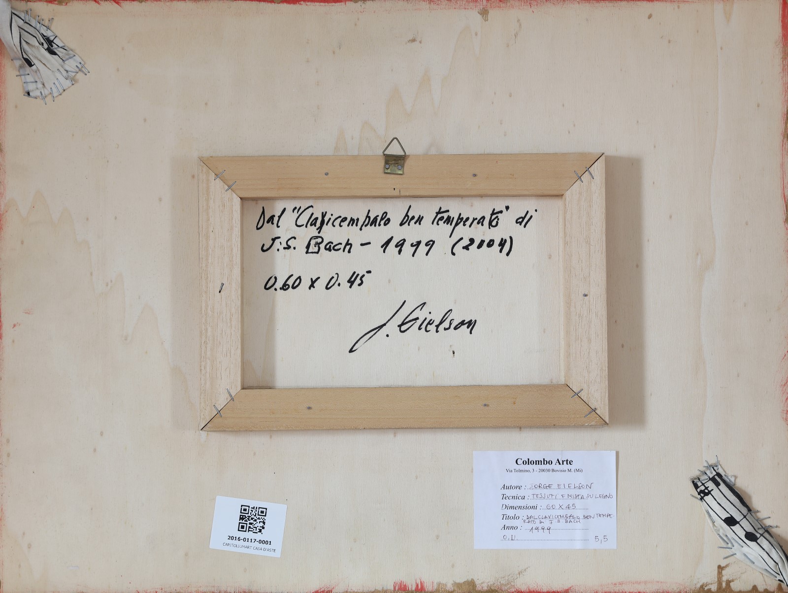 EIELSON JORGE (1924 - 2006) Dal clavicembalo ben temperato di J.S. Bach. 1999. Tecnica mista su tavola. Cm 60,00 x 45,00. Al retro titolo, firma e anno. Cartiglio descrittivo a cura di Colombo Arte, Bovisio (MI). Opera archiviata presso l'archivio Eielson, Il Chiostro Arte Contemporanea, Saronno, come da documentazione fotografica allegata all'opera riportante il relativo numero d'inventario.