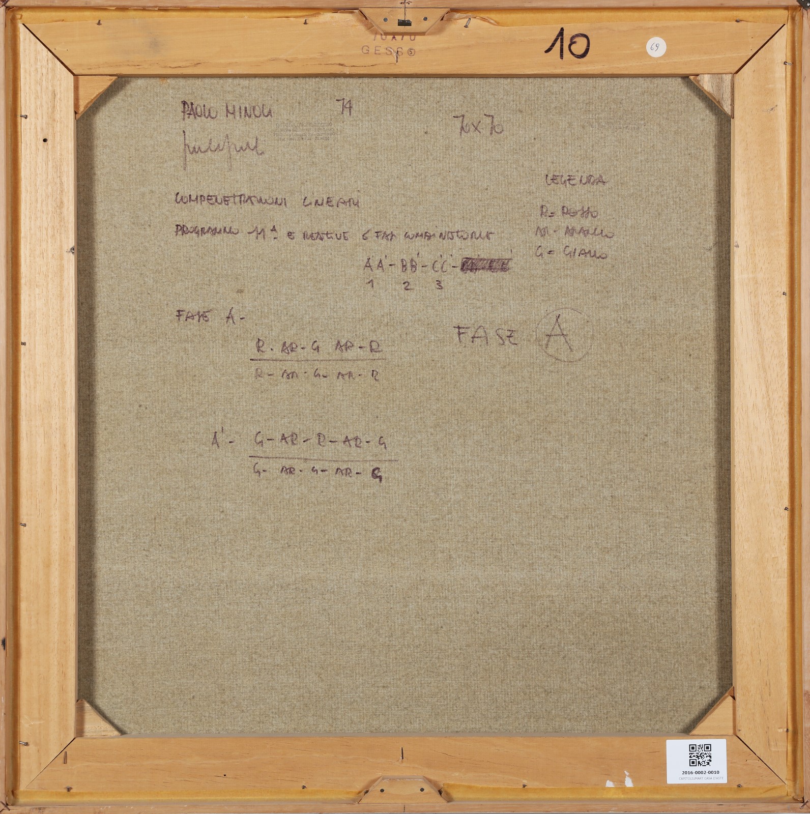 MINOLI PAOLO (1942 - 2004) Compenetrazioni lineari. Fase A. 1974. Oil on canvas . Cm 70,00 x 70,00. Signature, title and date at the back. Cornice presente