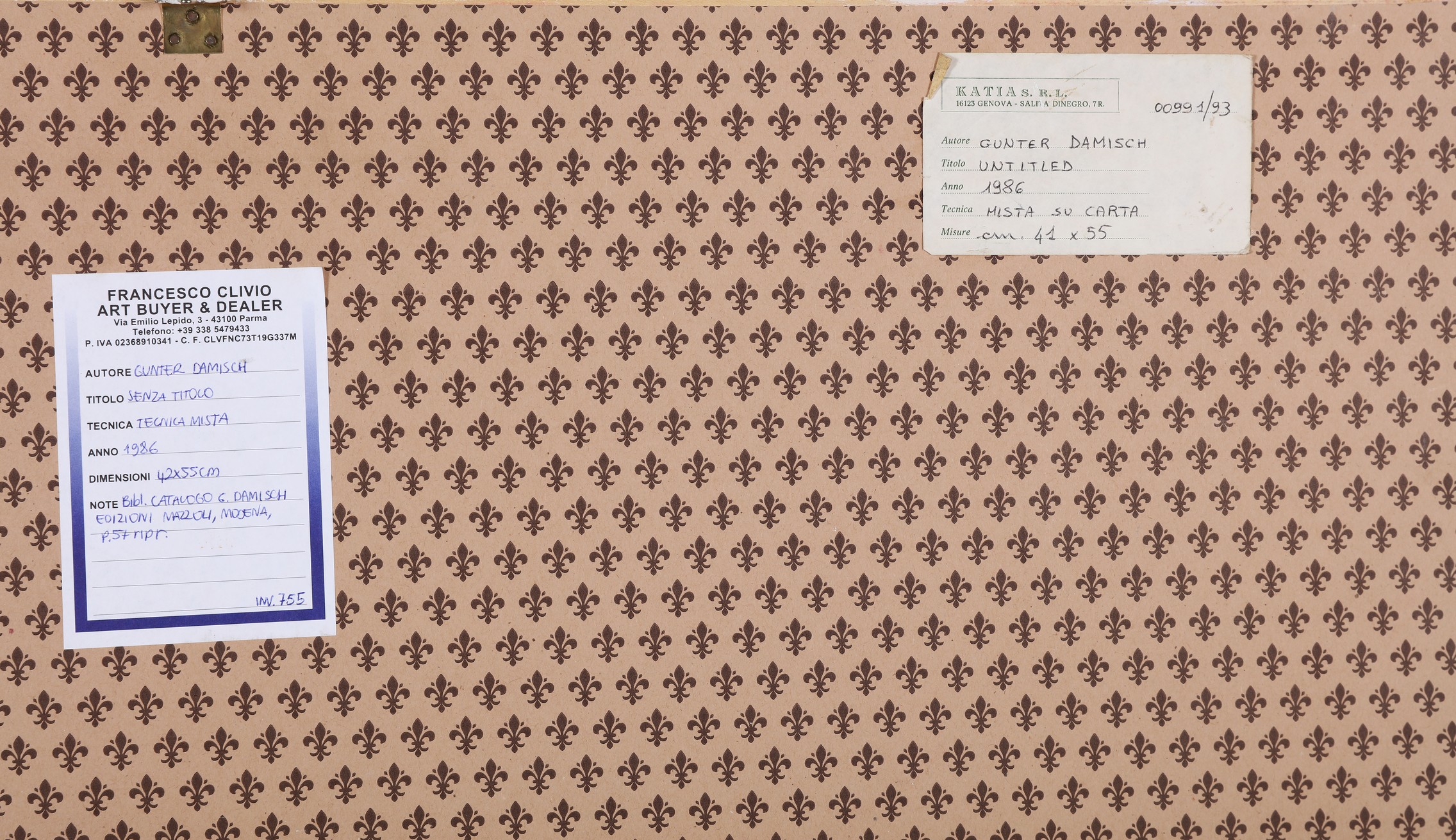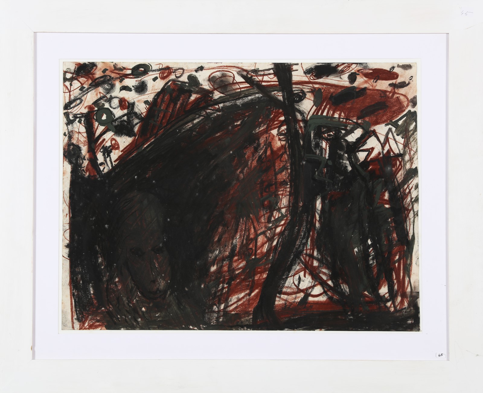DAMISCH GUNTER (n. 1958) Senza titolo. 1986. Tecnica mista su carta. Cm 55,00 x 42,00. Al retro cartiglio descrittivo a cura di Francesco Clivio Art Buyer & Dealer, Parma e cartiglio a cura di Katia Srl, Genova. Pubblicazioni: G. Damisch, Edizioni Mazzoli, Modena, Pag.57. Cornice presente