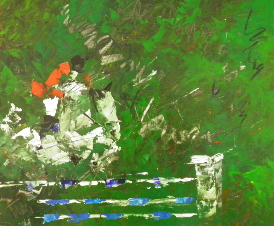 TORALDO FRANCESCO CATANZARO 1974 IL SALTO OSTACOLI ACRILICO SU TAVOLA cm 46 x 55 Firma in basso a sinistra Al retro firma e titolo Autentica del Maestro su fotografia