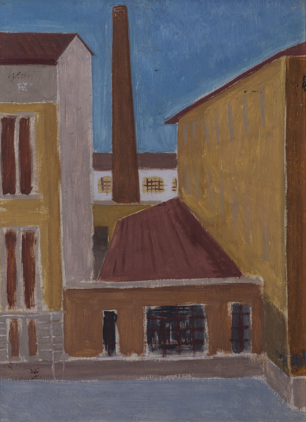 ATANASIO SOLDATI (1896-1953)Officina con ciminieraOlio su tavolaCm...