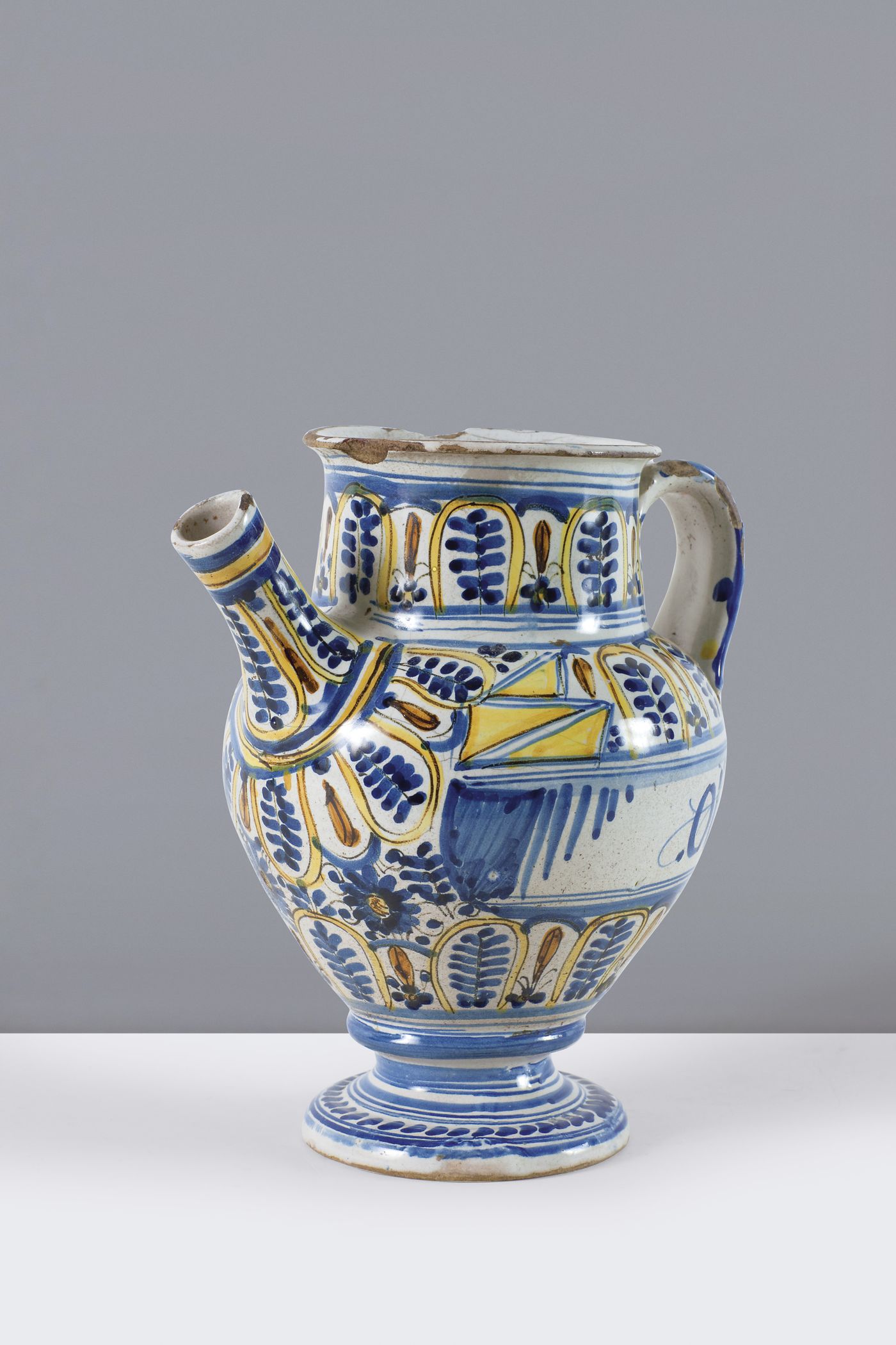 VASO DA FARMACIA - Versatoio in maiolica dipinta in policromia, Savona XVIII secolo, h cm 20-21, Sbrecciature