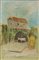 Giovanni Stradone, Casolare, 1965, olio e sabbia su cartone telato, cm. 44,6x29,7, firmato, intitolato e datato al retro, timbro "Mauro Borgiani Galleria d'Arte La Sfinge Roma", opera pubblicata sulla monografia