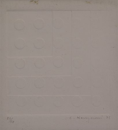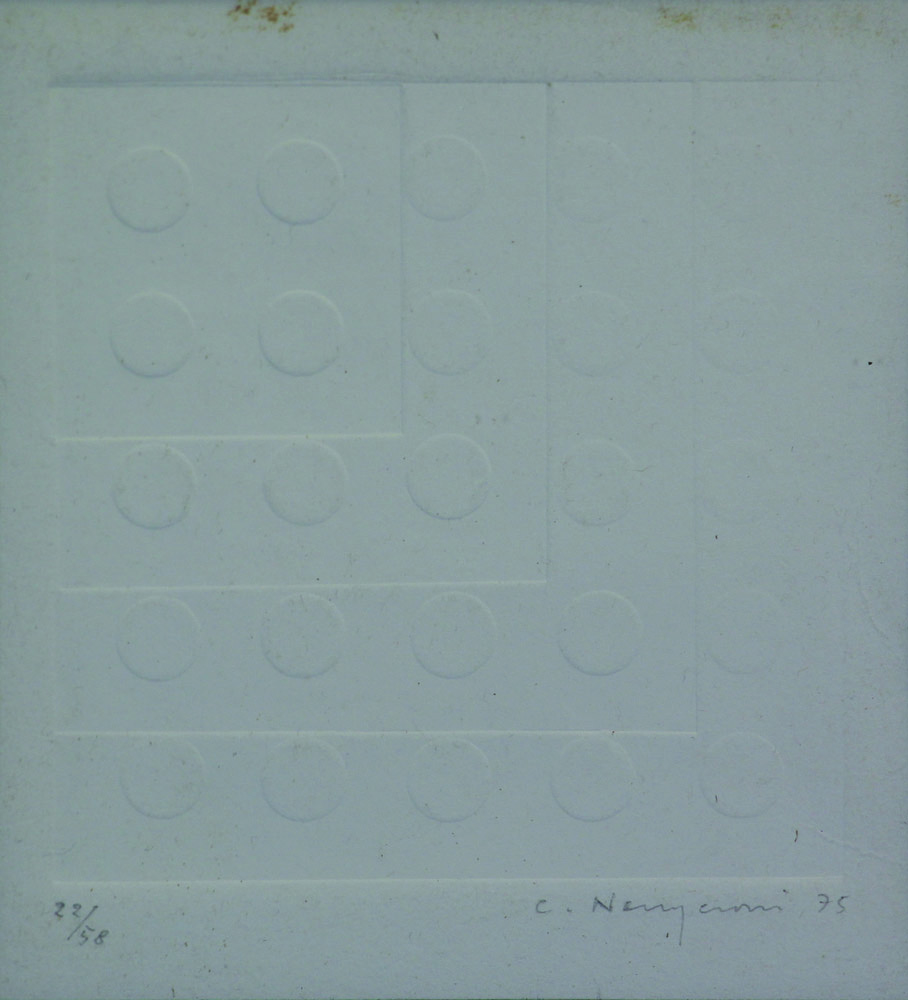 Carlo Nangeroni, Senza titolo, 1975, incisione su carta, cm. 10,5x9,5, es. 22/58, firmata e datata in basso a destra