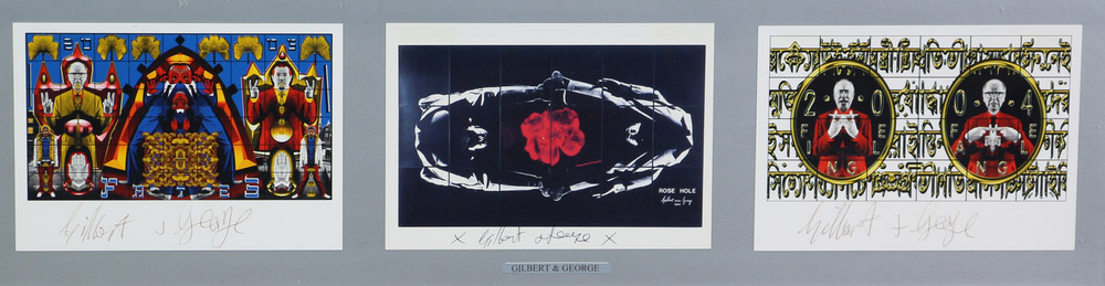 Gilbert & George, Fingle Fangle, 2004 - Rose Hole, 1980 - Fates, 2005, set di tre carloline firmate, cm. 10,5x15 ciascuna