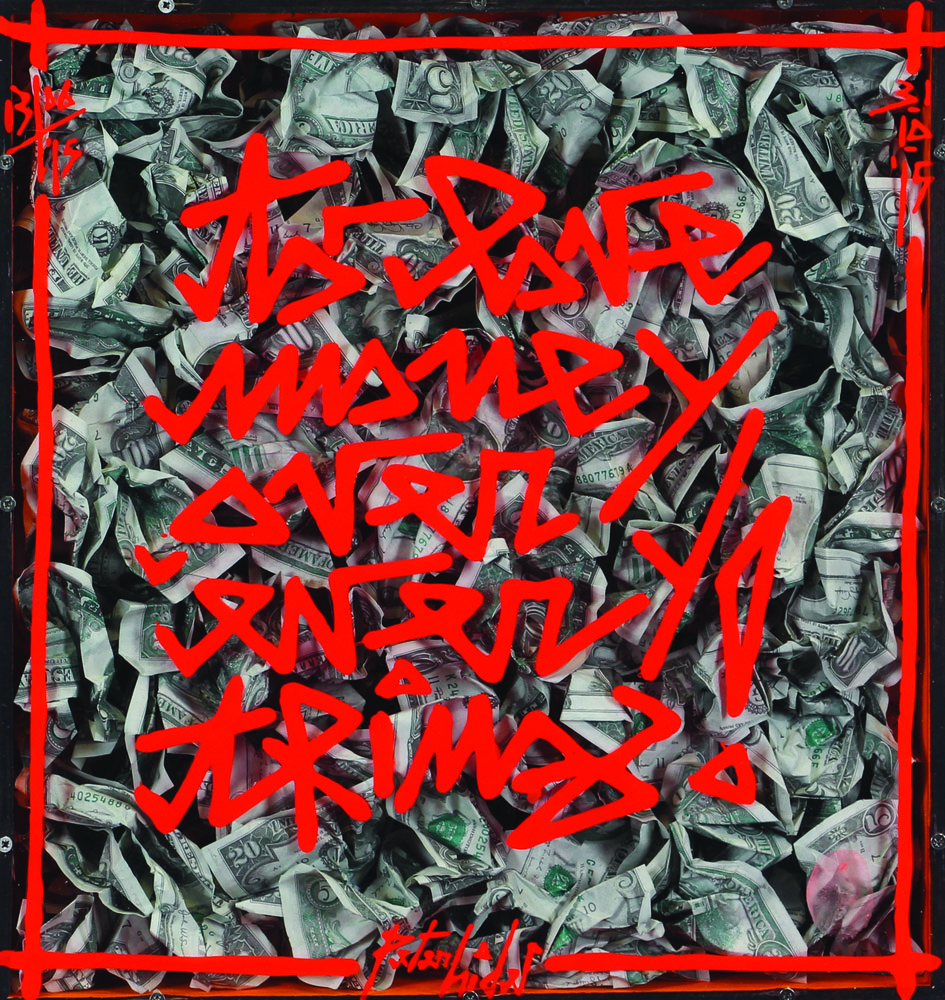 Peter Hide, To Love Money Over Everything! - Reliquary, 2015, tecnica mista e banconote (fac-simile) in scatola di legno con copertura di plexiglass dipinta, cm. 37,5x35x6, firmata in basso al centro e al retro, certificato di autenticità dell'artista su fotografia