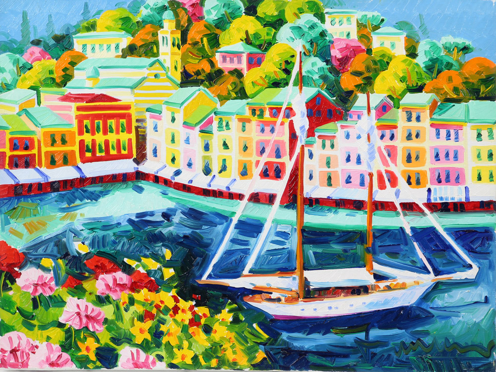 Athos Faccincani, Veliero a Portofino con Luce, olio su tela, cm. 30x40, firmato in basso a destra, firmato e intitolato al retro, certificato di autenticità dell'artista su fotografia, senza cornice