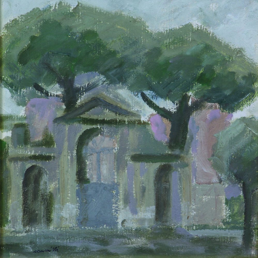 Franco Marzilli, Villa Paganini, 1963, olio su tavola, cm. 30x30, firmato in basso a sinistra, firmato, intitolato e datato su etichetta al retro