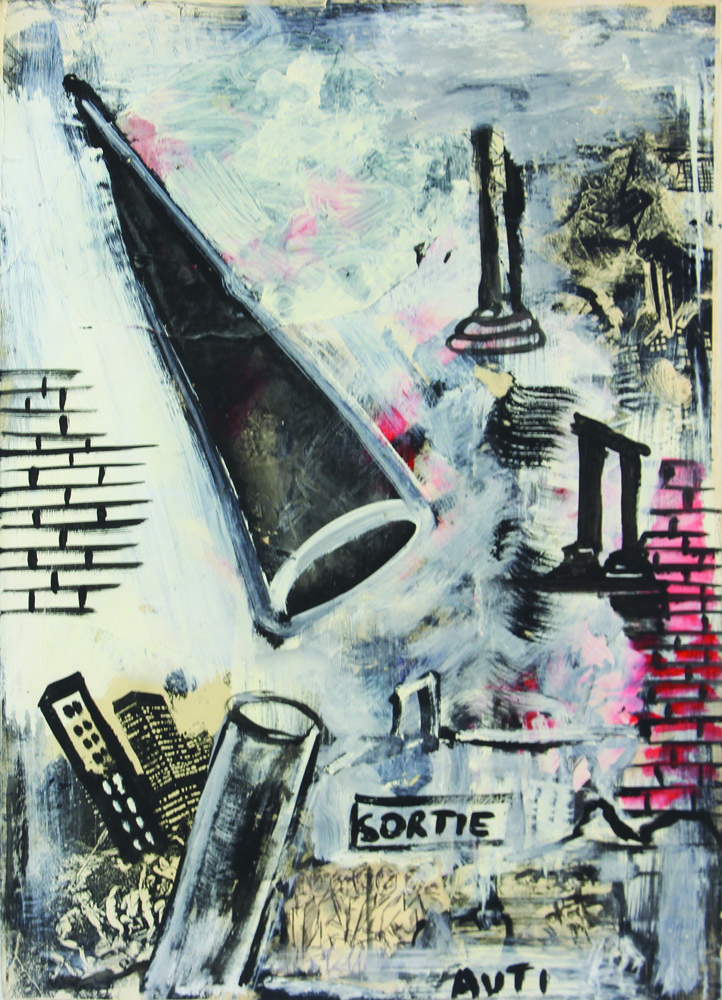 Filippo Auti, Sortie, tecnica mista e collage su cartone, cm. 70x50, firmato...