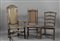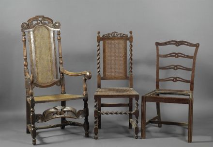 Due sedie e una poltrona in legno, di varie forme e misure.