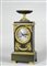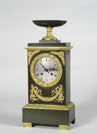 Orologio da tavolo in metallo brunito, cassa a plinto, con placche in metallo...