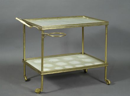 Carrello porta vivande in metallo dorato a due ripiani, cm.67,5x84x50.