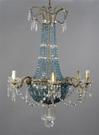Lampadario in metallo e vetri colorati a sei luci, cm. h. 74