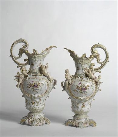 Coppia di versatoi in porcellana policroma con decorazioni a rilievo, Francia, XIX sec.