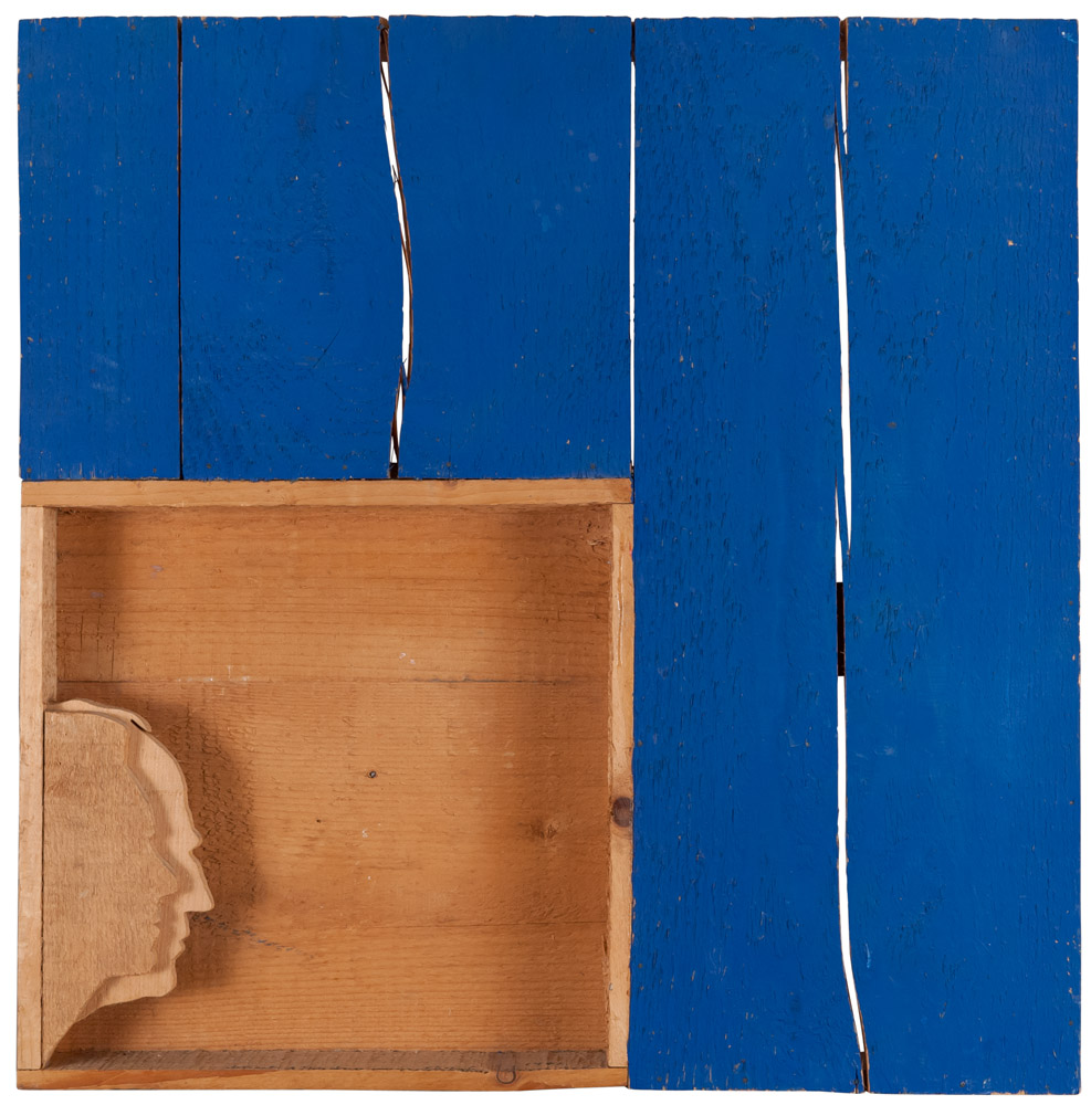 MARIO CEROLI (Castelfrentano 1938) Ritratto dell'autore con figura femminile, 1986 Scultura in legno pino di Russia, cm. 55,5 x 55,5 x 6,5 Firma, data e dedica in basso Autentica su foto dell'Artista in data 12/02/2016