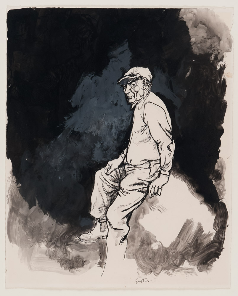 RENATO GUTTUSO (Bagheria 1912 - Roma 1987) Uomo seduto, 1951/52 China su carta, cm. 33,5 x 41,4 Firma in basso a destra Autentica dell' Associazione Archivi Guttuso in data 02/06/1997 con il n° 1815410720