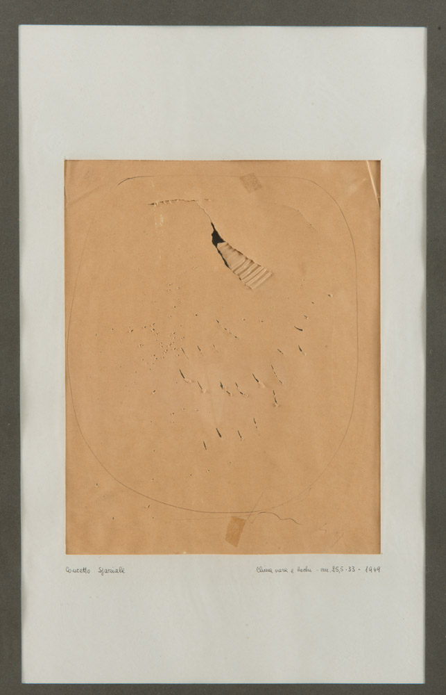 LUCIO FONTANA (Argentina 1899 - Varese 1968) Concetto spaziale, 1949 Penna a sfera, buchi e strappi su carta, cm. 33 x 22,5 Firma e data in basso a destra PROVENIENZA Teresita Rasini Fontana, Milano G.A. Roccamonte, Roma PUBBLICAZIONI L. M. Barbero, Lucio Fontana. Catalogo generale delle opere su carta, tomo II, Skira, Milano 2013, p. 577, n. 49 DSP 68