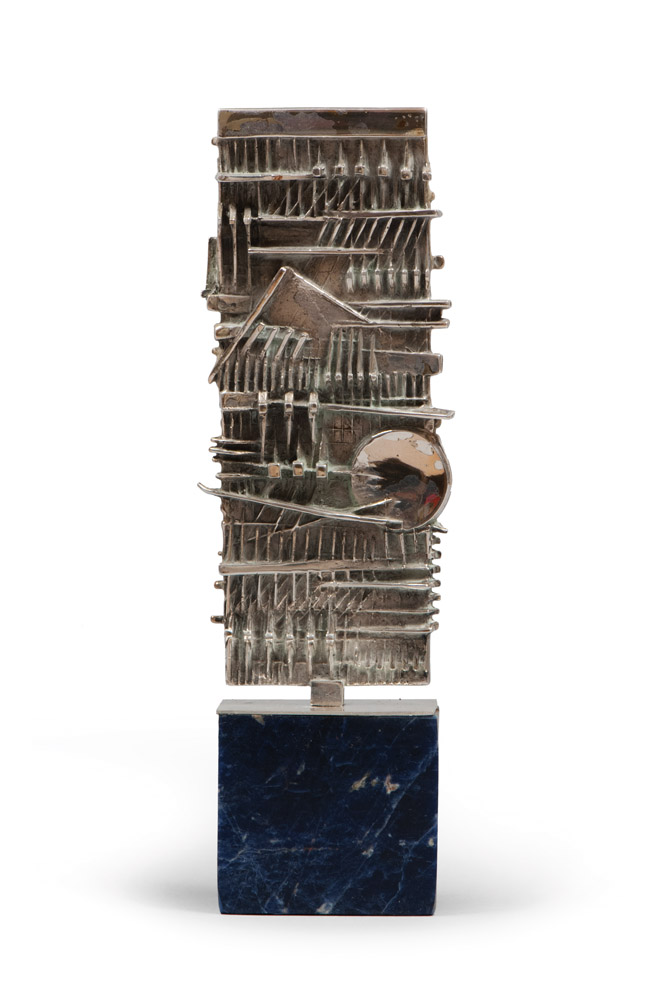 ARNALDO POMODORO (Morciano di Romagna 1926) Progetto, 1977 Scultura in argento e base in sodalite, ex. 25/90 Misure totali cm. 28 x 5 Opera accompagnata da certificato di autenticità e archiviata presso la Fondazione Arnaldo Pomodoro con la sigla M/78/10