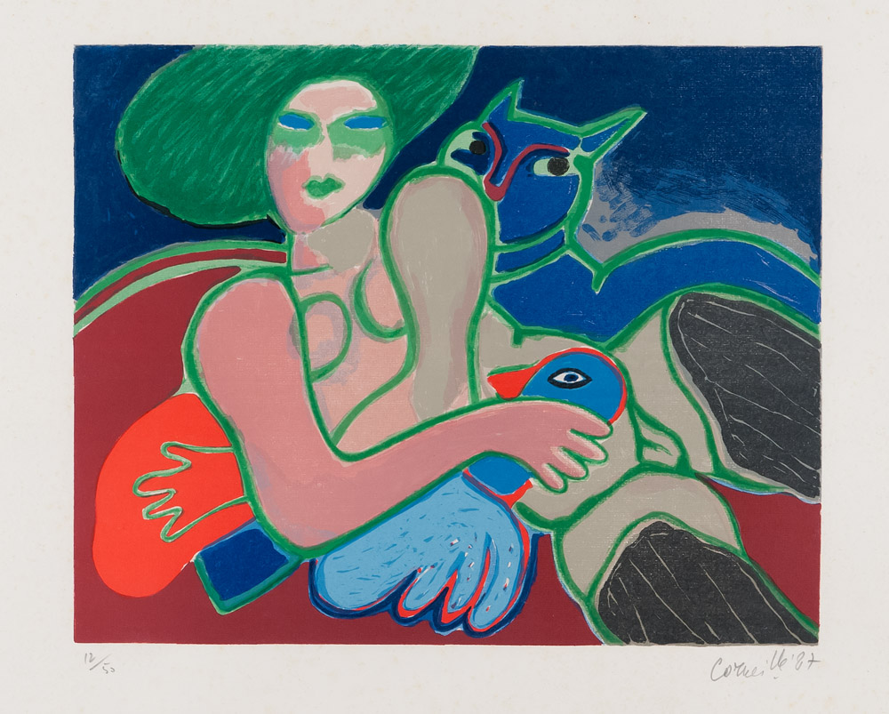 CORNEILLE (Lieg 1922- Auvers-sur-Oise 2010) Nudo con gatto e uccello, 1987 Litografia a colori, ex. 12\50 Misure della lastra, cm. 32 x 40