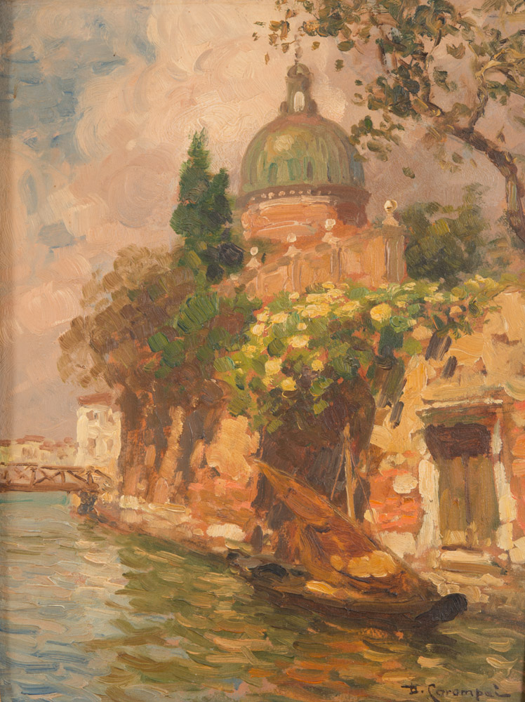 DUILIO COROMPAY (Venezia 1876 - Noventa Vicentina 1952) Cupola solitaria, anni '20 Olio su cartone pressato, cm. 42 x 31,8 Firma in basso a destra Etichetta al retro ESPOSIZIONI III Mostra d'Arte del Friuli Occidentale, Pordenone, settembre 1925