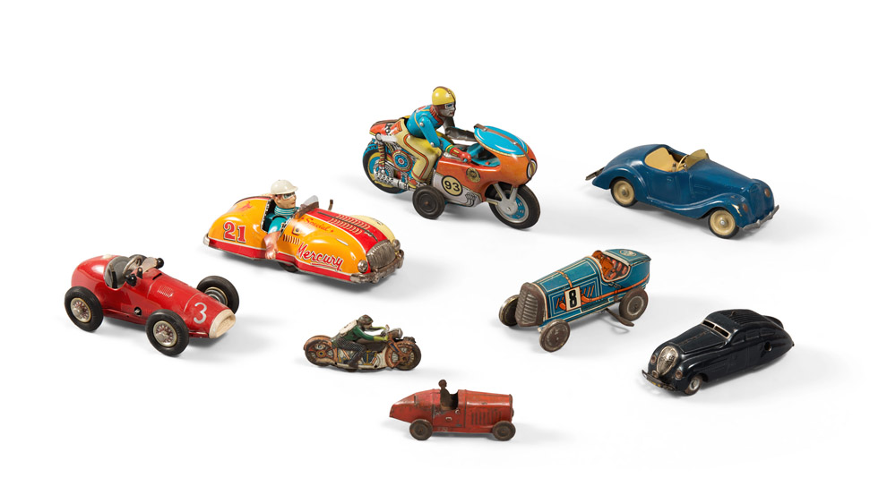 GRUPPO DI OTTO GIOCATTOLI D'EPOCA composto da modellini di automobili e motociclette in latta e ferro verniciati, alcuni con chiave a molla Misure varie Marchi vari: Omicron, Torino - O.M.I, Delhi - Made in France - Schuco, Made in Germany - Asshi Toy, Made in Japan