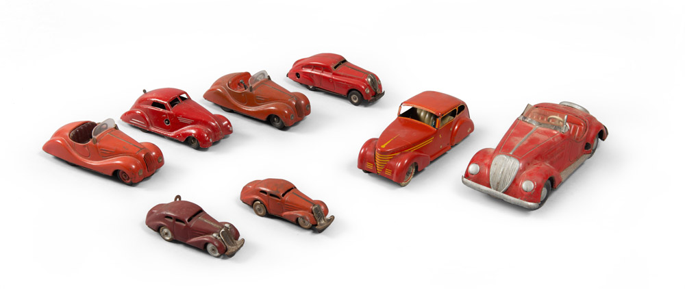 GRUPPO DI OTTO GIOCATTOLI D'EPOCA composto da modellini di automobili in latta e ferro verniciati, alcune con carica a molla e leva start/stop Misure varie Marchi vari: Ingap, Padova - Schuco, Made in Germany
