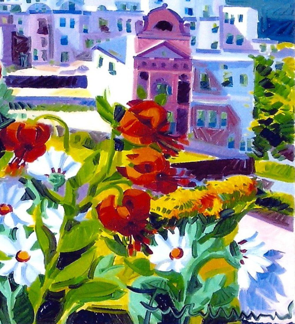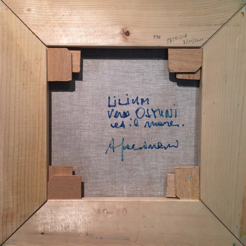 Athos Faccincani 1951, Peschiera del Garda (Vr) - [Italia] Lilium verso Ostuni ed il mare olio su tela 40x40 cm 2011 firma dell’artista in basso a destra e sul retro certificato di autenticità firmato dall'artista