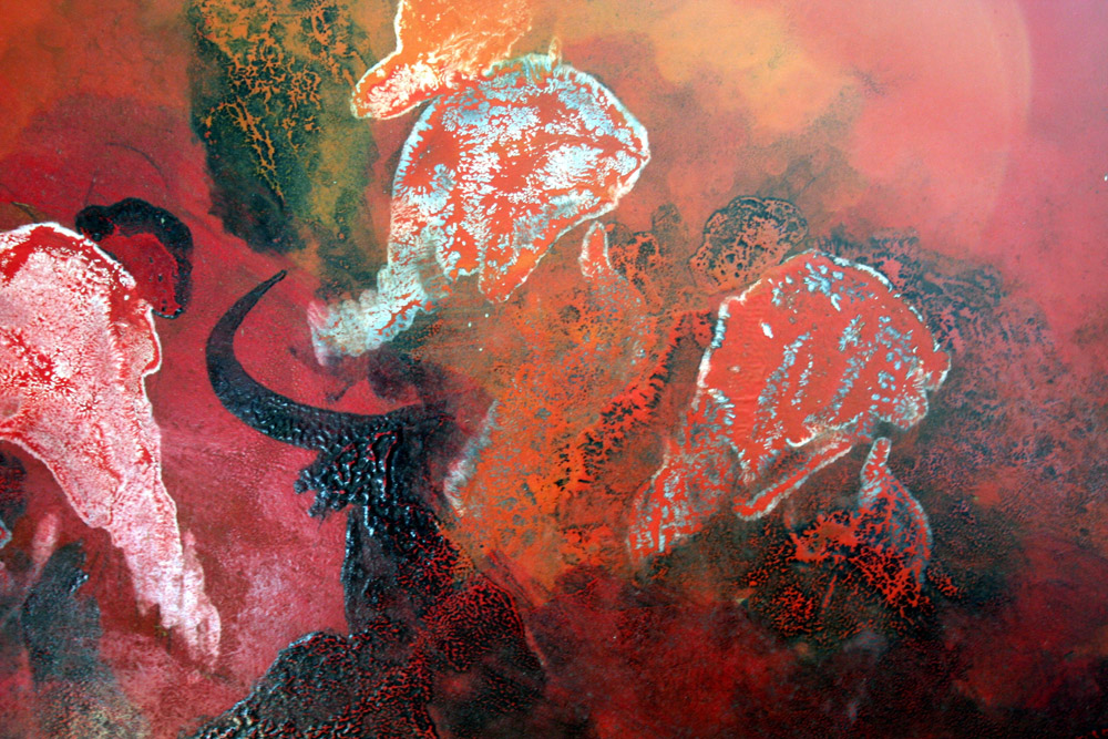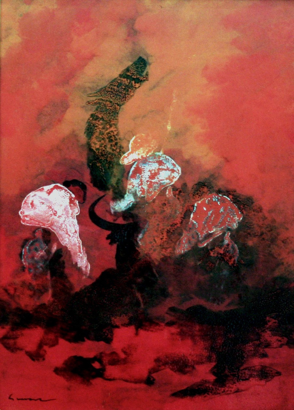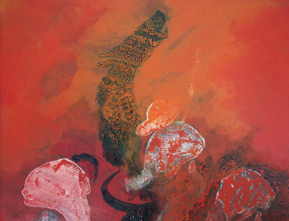 Jose Guevara 1926, Huelva - 2010, Huelva [Spagna] Corrida olio, combustione del pigmento su faesite 70x50 cm c. 1990 firma dell'artista in basso a sinistra; opera con cornice certificato di autenticità firmato dall’artista